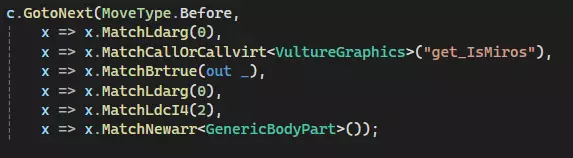 ILCursor将用于在函数中移动并进行修改。 接下来,我们需要选择一个插入代码的位置。必须选择在秃鹫羽毛生成之前,且在feathersPerWing变量被设置之后的位置,以确保我们能将该变量设为零并保持这一状态。在本指南中,我会选择colorWaves方法正下方的位置,因为这个位置大小合适,且远离任何分支。 重要提示:如果在分支附近修改代码,需要确保分支不会跳过你的代码。你可以查看BrTrue/BrFalse/Br操作码的操作数,了解它们的分支目标。建议目前先避开这些分支,直到你能熟练编写基本的IL钩子为止。那么我们开始匹配吧。我们会匹配一个相当完整的方法,让你能轻松上手。这些方法的长度会有很大差异,但这个方法是个不错的起点,因为它非常容易理解。