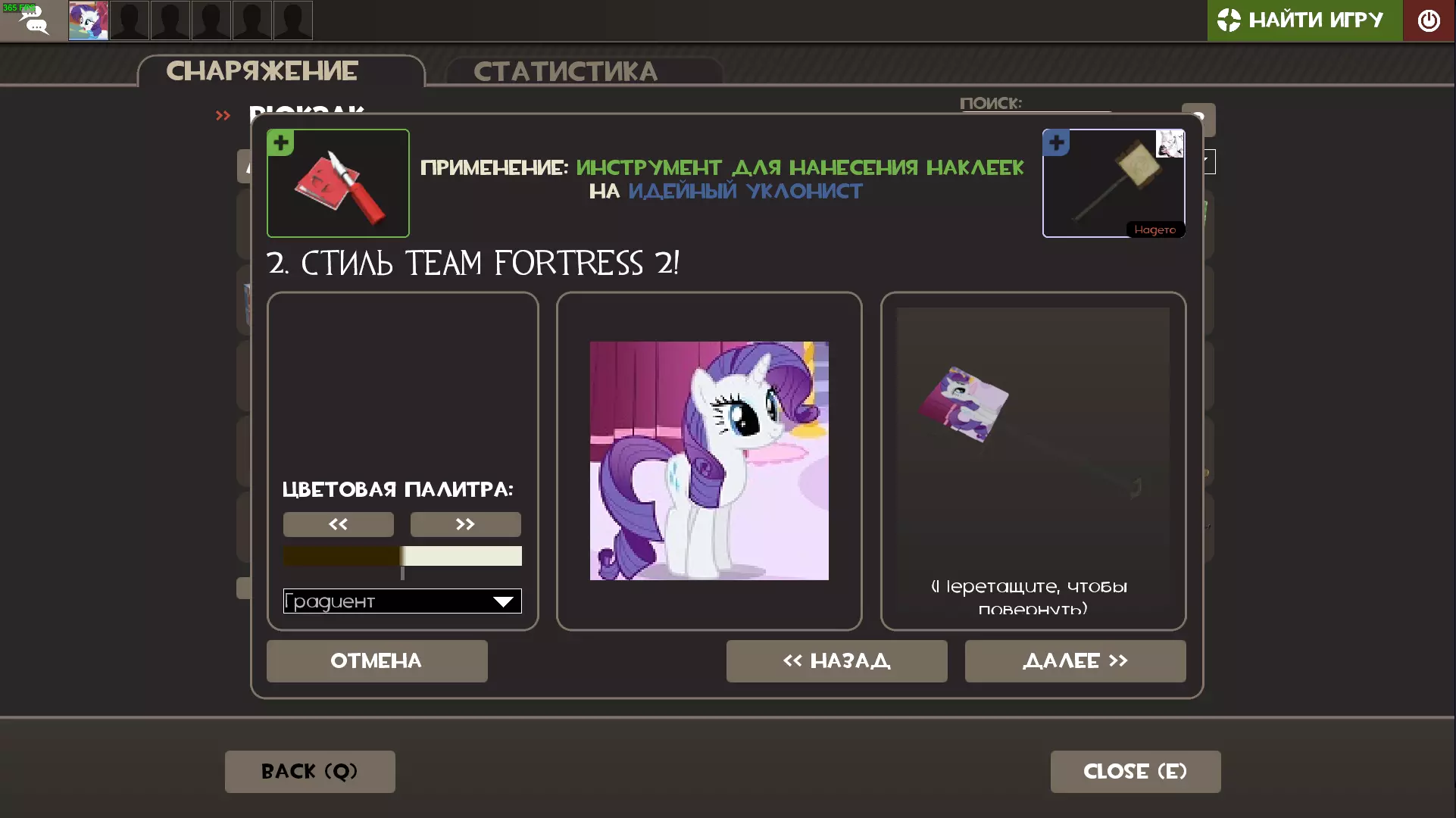 现在我们来检查,确保所有内容都与上方截图一致(提醒一下,您的图片必须是PNG格式!)。我们要确认所有路径都已正确设置,图片已正确命名,尺寸合适且格式为PNG。现在我们进入游戏并选择【贴纸工具】,选中后,配合创意工坊使用,然后通过路径【Team Fortress 2 - tf - custom - fullcolor - scripts - items - custom_texture_blend_layers】选择图像。完成。
