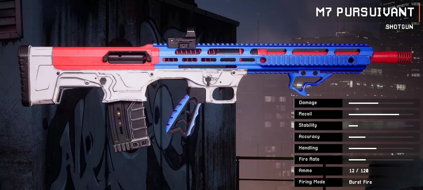 枪管:无 枪管配件:12号口径沉积式喉缩 握把:钻石防滑握把 枪托:折叠式骨架枪托 瞄准镜:Sheath RDSM7 Pursuivant瞄准镜
