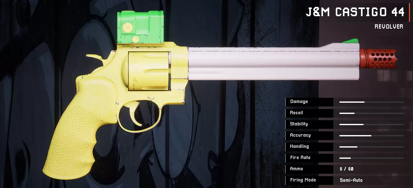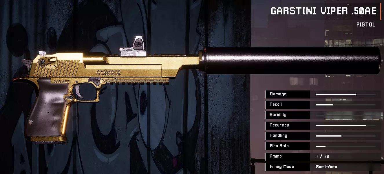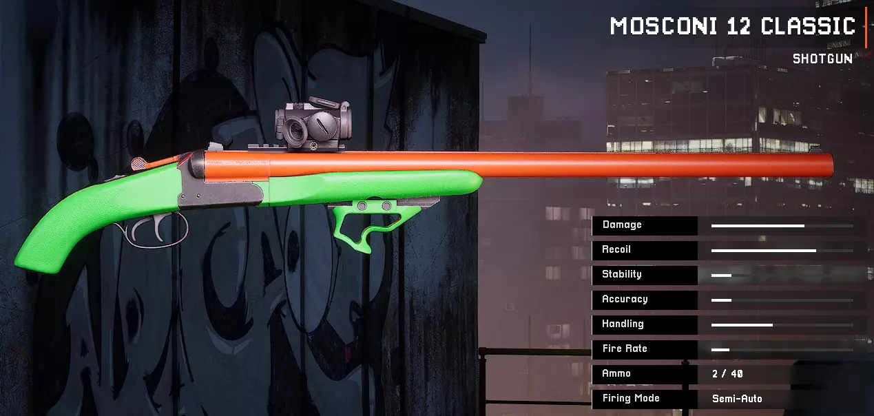枪管:远程枪管 弹匣:快拔弹匣 枪托:无 瞄准镜:鞘式红点瞄准镜 枪管延长件:12号口径沉降喉缩 握把:多孔握把 垂直握把:鬼武者角度握把 副武器:Garstini Viper 50AE