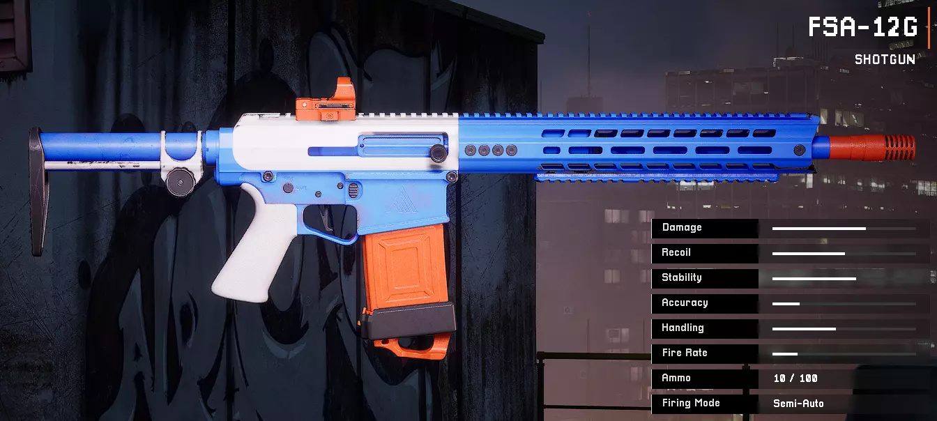枪管:远程枪管 瞄准镜:紧凑型红点瞄准镜 枪托:近距离战斗枪托 垂直握把:角度幽灵握把FSA 12G