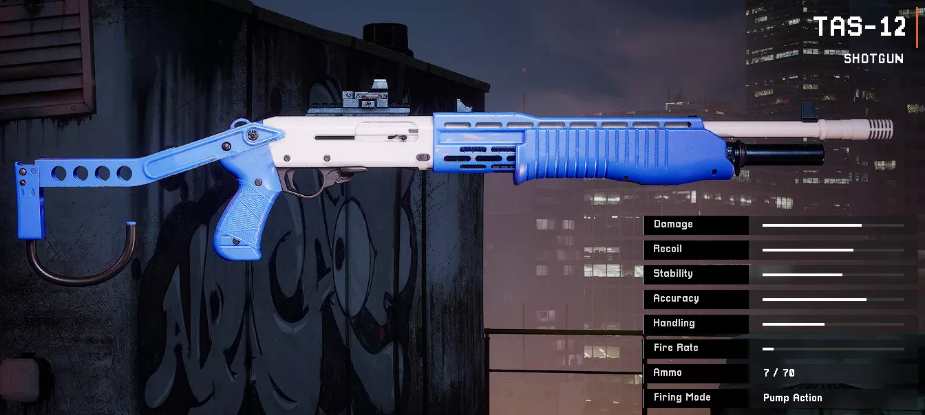 枪管:远程枪管 弹匣:快速抽拉弹匣 枪托:轻型枪身 瞄准镜:鞘式红点瞄准镜 枪管延伸:12号口径沉降喉缩 握把:多孔握把 垂直握把:幽灵斜角握把 TAS 12