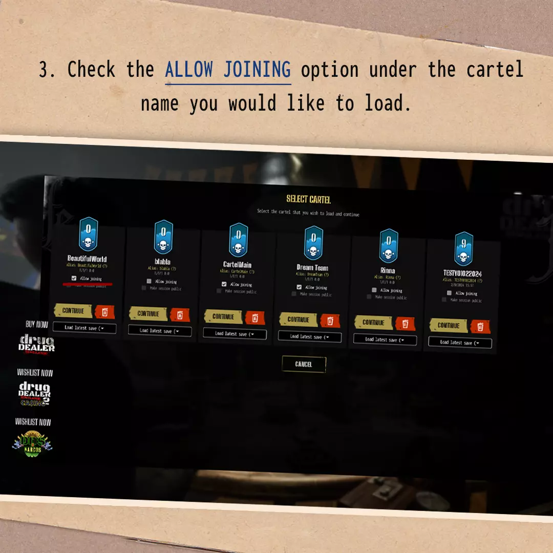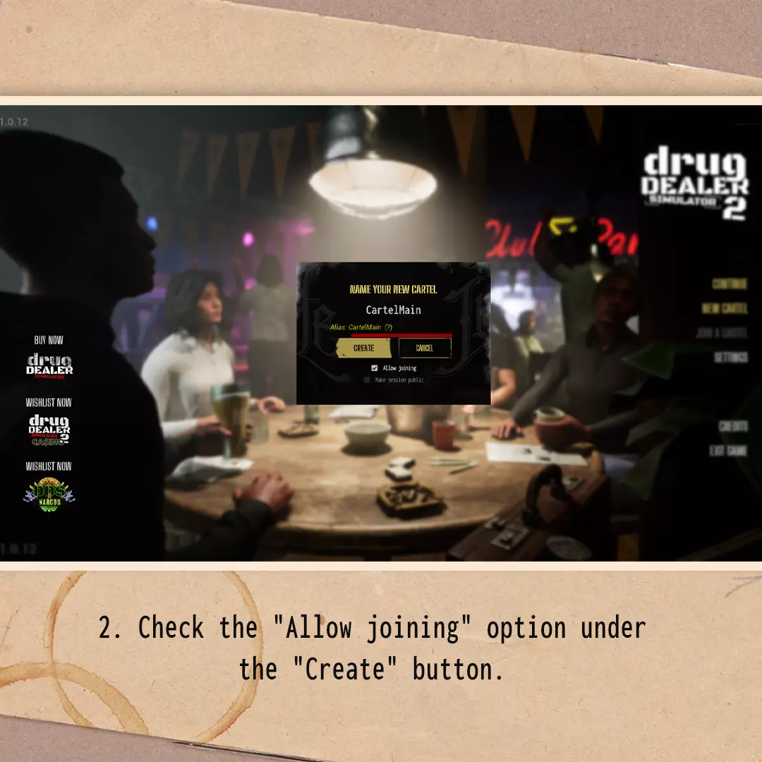 ### 《毒枭模拟器2》合作模式存档创建与转换指南 一、如何创建新的合作模式会话? 1. 在主菜单中选择【新建卡特尔】选项。 2. 勾选【创建】按钮下方的【允许加入】选项。 3. 在角色选择菜单中,点击屏幕左侧朋友昵称旁的【邀请】按钮来邀请他们。 4. 若已开始会话但未邀请朋友,可在暂停菜单右上角点击朋友昵称旁的【邀请】按钮进行邀请。 注意:你的朋友必须在Steam上处于在线状态,你才能正常邀请他们。