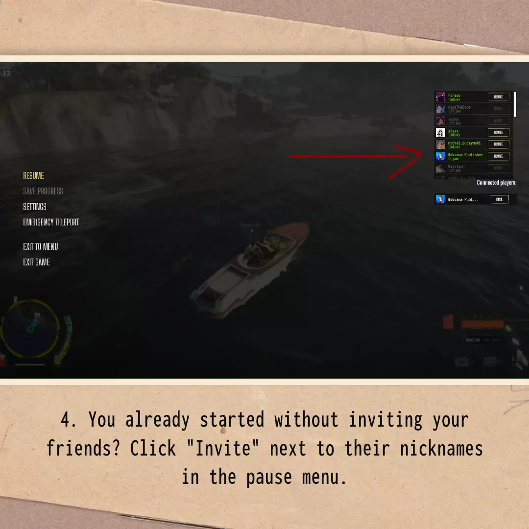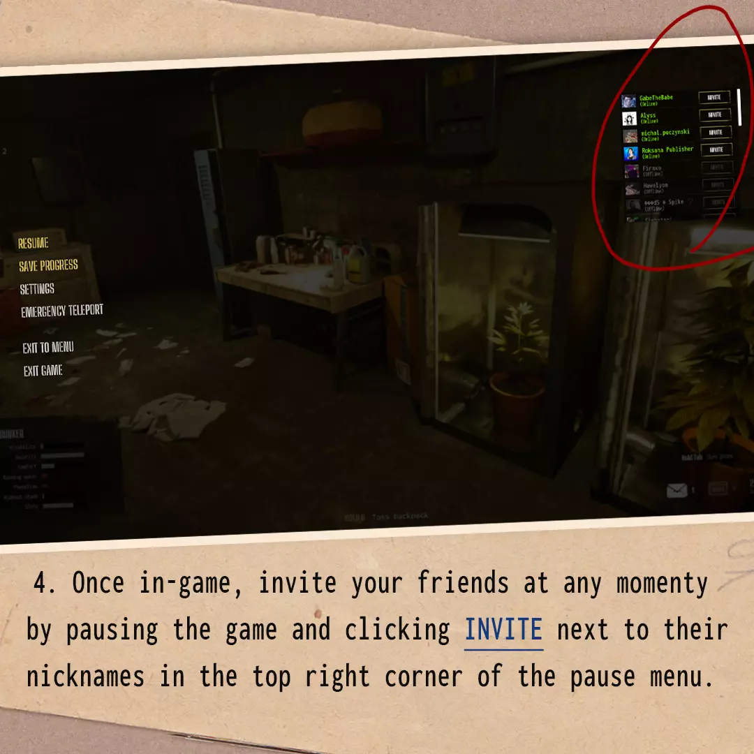 II. 如何从单人模式切换到合作模式? 1. 保存游戏进度。 2. 返回主菜单。 3. 点击【继续游戏】,并勾选你想要加载的帮派名称下方的【允许加入】选项。 4. 进入游戏后,随时可以通过暂停游戏,点击暂停菜单右上角朋友昵称旁的【邀请】来邀请他们。 注意:你的朋友必须在Steam上处于在线状态,你才能正常邀请他们。