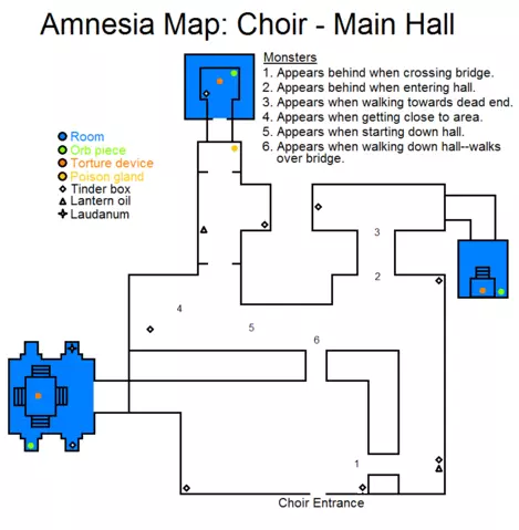 房间 球体碎片 刑具 毒腺 火绒盒 提灯用油 鸦片酊 怪物出现时机: 1. 过桥之后。 2. 进入大厅时。 3. 靠近死胡同处。 4. 靠近此区域时。 5. 走下走廊时。 6. 走下走廊并过桥后。 从左向右移动。主要是要小心怪物,躲在柱子后面等它们离开。别忘了去拿阿格里皮斯药剂所需的花朵。收集完所有的球体碎片后,前往十字耳堂。十字耳堂