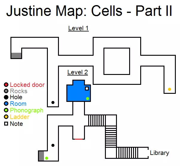 锁着的门 - 关闭的门 石头 - 石块 洞 - 孔洞 房间 - 房间 留声机 - 留声机 梯子 - 梯子 笔记 - 便条 通过通风管道时一直向左走。着陆后收集所有能看到的物品,然后前往图书馆。 图书馆