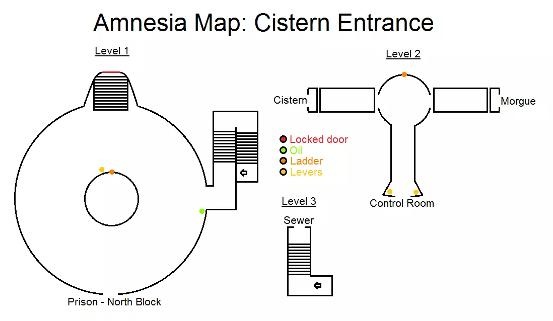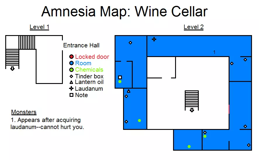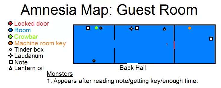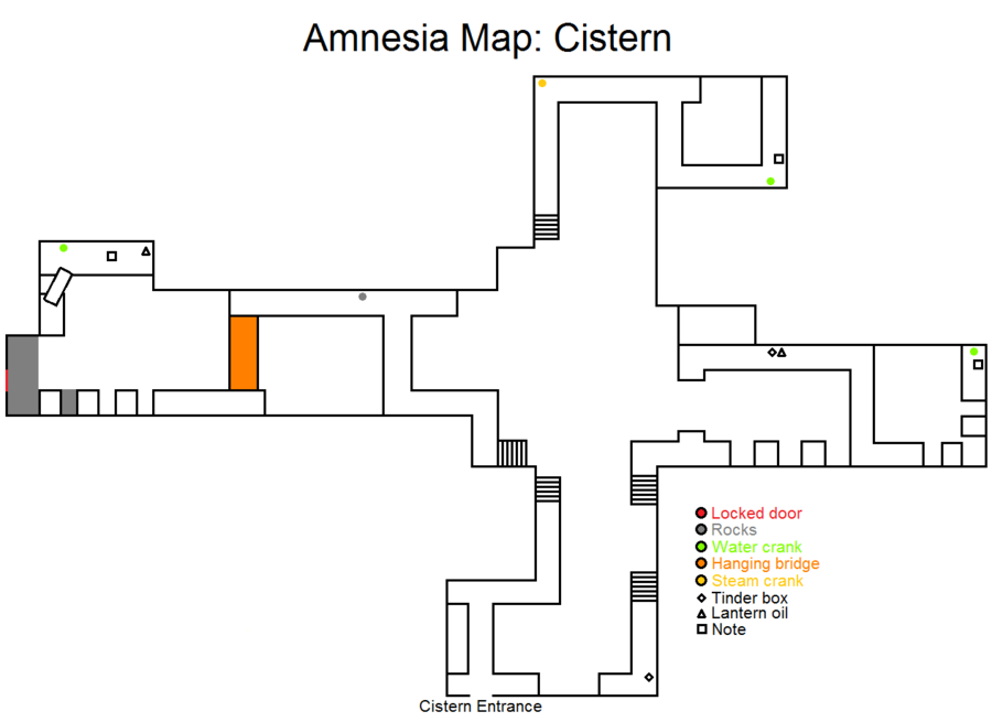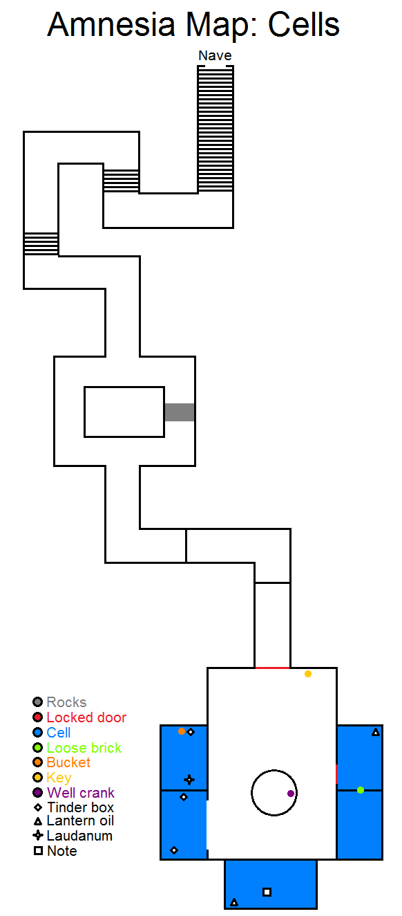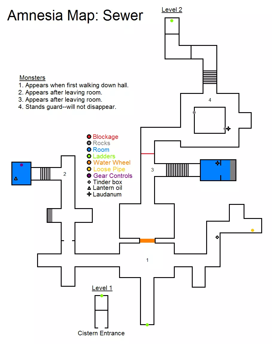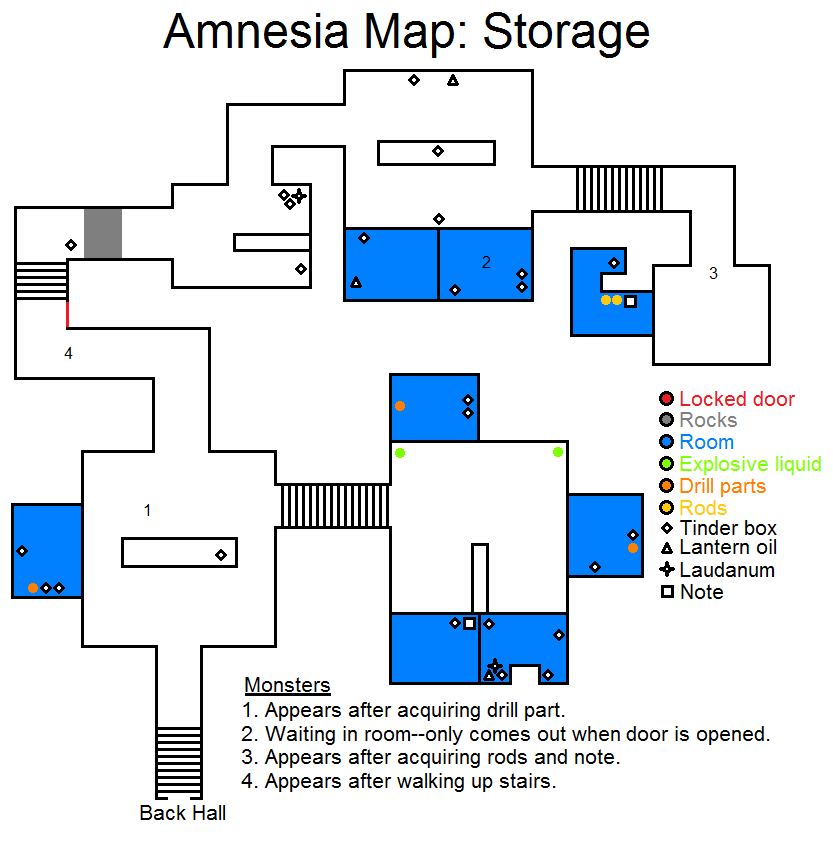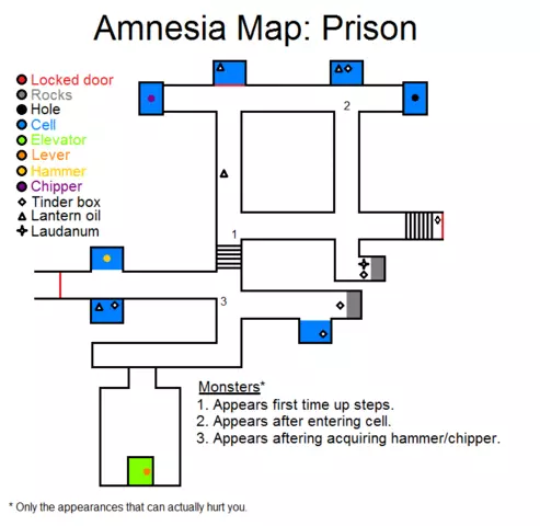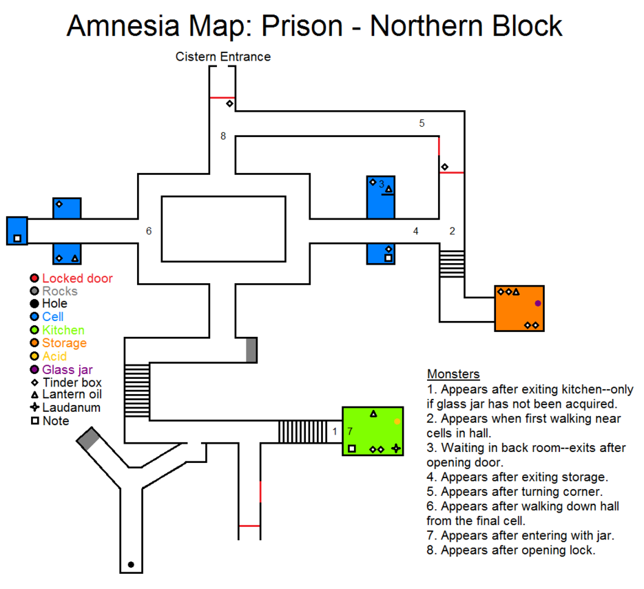 锁着的门 岩石 洞 牢房 厨房 储藏室 酸液 玻璃罐 火绒盒 提灯油 鸦片酊 笔记 怪物出现条件:1.离开厨房后,若没有玻璃罐 2.首次经过牢房附近时 3.待在房间内等待门被打开 4.离开储藏室后 5.转过拐角后 6.穿过走廊后第七个房间 - 若携带罐子进入 第八个房间 - 打开锁之后 沿着隧道向右爬行。根据地图前往储藏室方向,途中收集所有能拿到的物品。拿到罐子后跑到厨房,将酸液倒入桶中,然后用酸液浇灌挡住通往蓄水池(在8号怪物附近)的锁。用锤子和凿子敲开锁,前往蓄水池。 通往蓄水池的路径