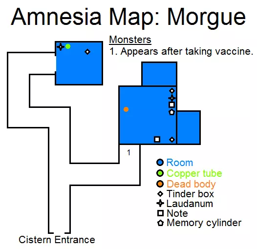 房间 - 房间 铜管 - 铜管 尸体 - 尸体 火绒盒 - 火绒盒 鸦片酊 - 鸦片酊 笔记 - 笔记 记忆圆筒 - 记忆圆筒 要进入停尸房,需要将桥完全放下,为此需找到地上的石头并将其扔到平台上。 沿着走廊直走,不要向右拐,拿走所有散落的物品,包括铜管。返回有尸体的房间,收集所有散落的物品。用钻机钻开尸体,将带针的铜管插入颅骨。用针扎自己一下,然后跑回被淹没的集水池。集水池