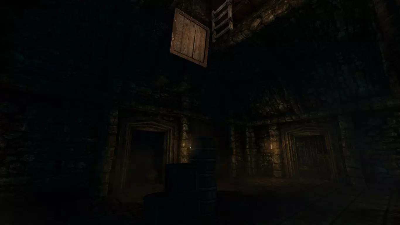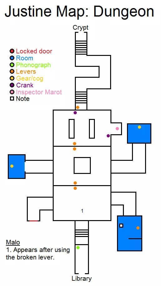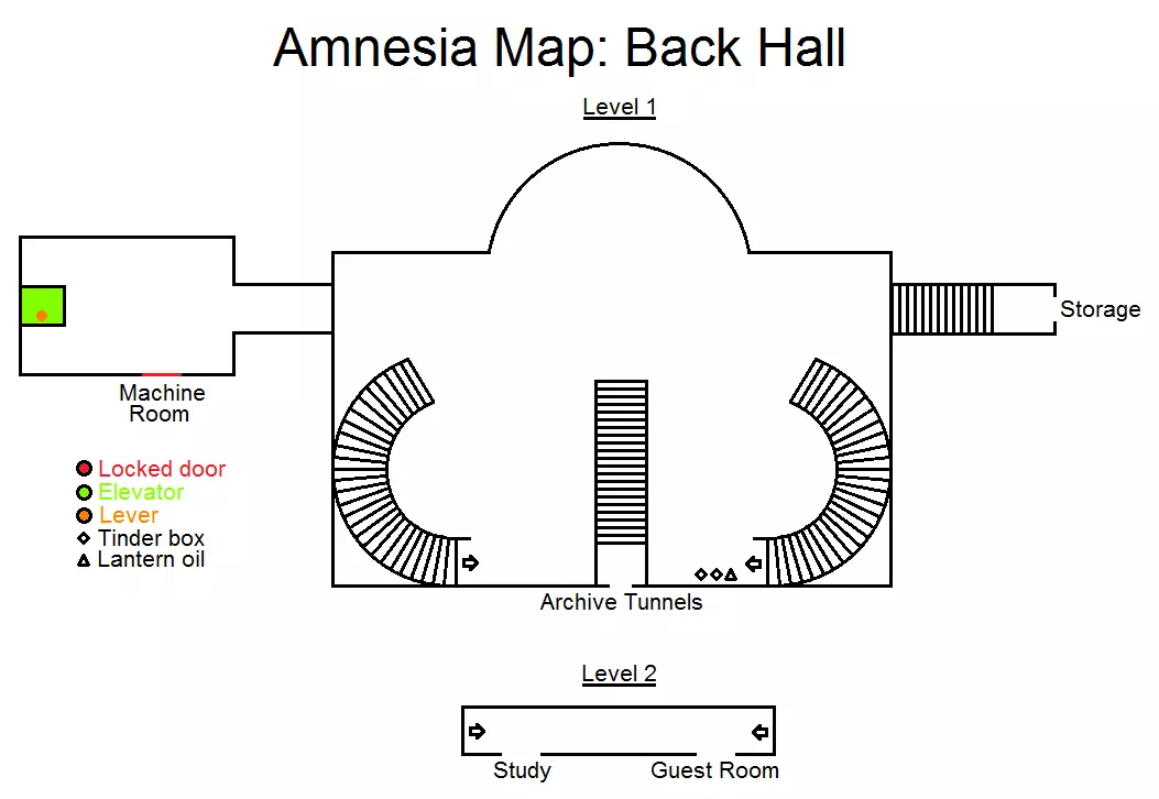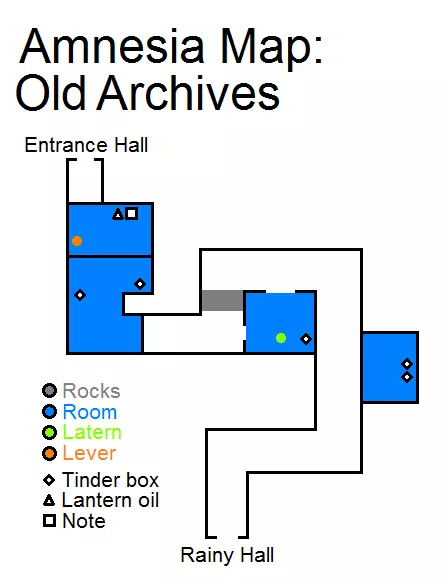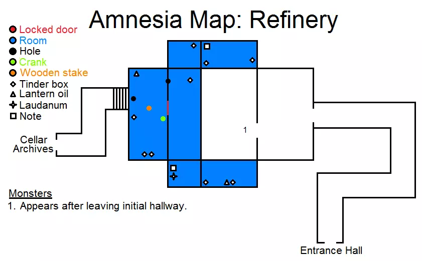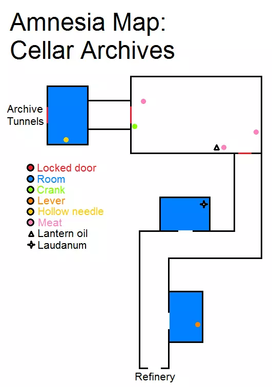 锁着的门 房间 洞 曲柄 木桩 金属齿盒 提灯油 鸦片酊 笔记 怪物 1 - 离开走廊后出现 沿着走廊前进。避开怪物。看到锁着的门,门右侧有一个洞 - 进入。接着看到活板门,要打开它需从天花板上拔出曲柄,然后开始转动阀门。 地下档案室