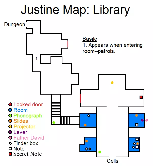 锁着的门 - 关闭的门 房间 - 房间 留声机 - 留声机 幻灯片 - 相框照片 投影仪 - 投影仪 杠杆 - 操纵杆 Father David - 大卫神父 火绒盒 - 火绒盒 笔记 - 便条 秘密笔记 - 秘密便条 检查所有房间,收集所有幻灯片(相框),然后去找大卫神父。选择是否让他活下去: 1 - 如果按4上3下的顺序给他照片,大卫会活下来。 2 - 如果按3上4下的顺序给他照片,大卫会死亡。别忘了从书架上的书后面拿走秘密物品。 做出选择后,会打开一个带有留声机的秘密通道。前往那里并下到地下室。 地下室