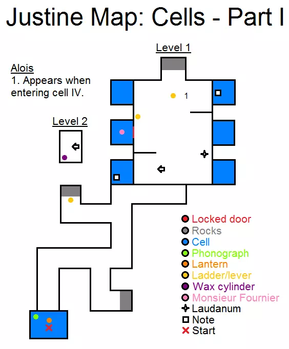 锁着的门 石头 牢房 留声机 提灯 梯子/拉杆 蜡筒 弗尔尼耶先生 鸦片酊 笔记 开始 拿起头顶的提灯并启动留声机。沿着走廊向左走,拿起一段梯子。进入主厅后,这里有两种事件发展方向: 1. 启动拉杆,这样会杀死囚犯,但你会打开带梯子的活板门。 2. 或者把箱子堆到天花板,打开活板门,然后使用梯子离开,无需杀人。 选择会影响结局。 镜头 - 第2部分
