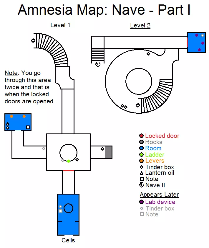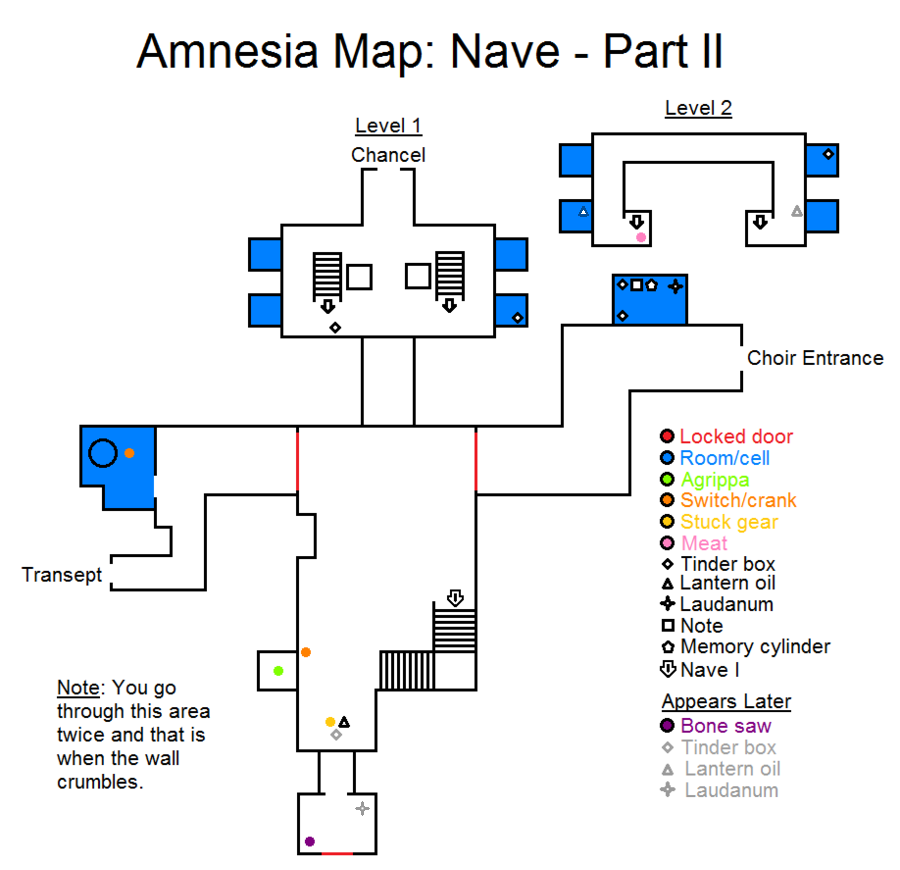 锁着的门 石头 房间 梯子 拉杆 火绒盒 提灯燃油 笔记 中殿 第二部分(后续出现) 实验室装置 火绒盒 笔记 我们会两次到访这个地点——旧位置会出现新物品。收集该关卡中能看到的所有东西,但暂时不要触碰拉杆。我们沿着楼梯向下走,穿过走廊,再下一段楼梯,直到遇见阿格里帕。(如果想达成所有结局,需要救他,但也可以跳过,下文会说明) 第二部分