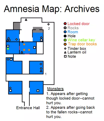 锁着的门 石头 房间 洞穴 酒窖钥匙 暗门书籍 火绒盒 提灯油 笔记 怪物出现 1 - 穿过锁着的门后出现,无法伤害你 2 - 石头掉落之后出现,无法伤害你 快速收集沿途所有房间的物品,过场动画和石头崩塌后前往洞穴(拿起地图)然后开始用重物砸它。接着不断拉动书籍,直到秘密通道打开,拿起钥匙后返回原来的地方。带上钥匙,迅速前往酒窖。 酒窖