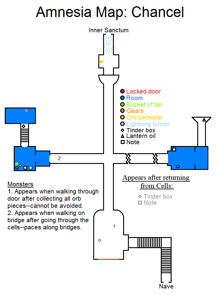 锁着的门 房间 一桶焦油 齿轮 球体基座 闪电隧道 火绒盒 提灯用油 笔记 怪物出现 1 - 收集完所有球体碎片后。(脚本) 2 - 从牢房逃脱后。建议优先进入祭坛,因为收集完6块球体碎片后,你会被关进监狱,右边的桥会坍塌,导致无法拾取物品。进入时要小心,入口处有怪物巡逻,避开它们后安静地拿取物品,然后前往克利罗斯和耳堂。 逃离牢房后。 在左边的房间需要停止机械装置。将石头扔进齿轮,然后直走进入内部圣所(见下文)。 克利罗斯 - 通道