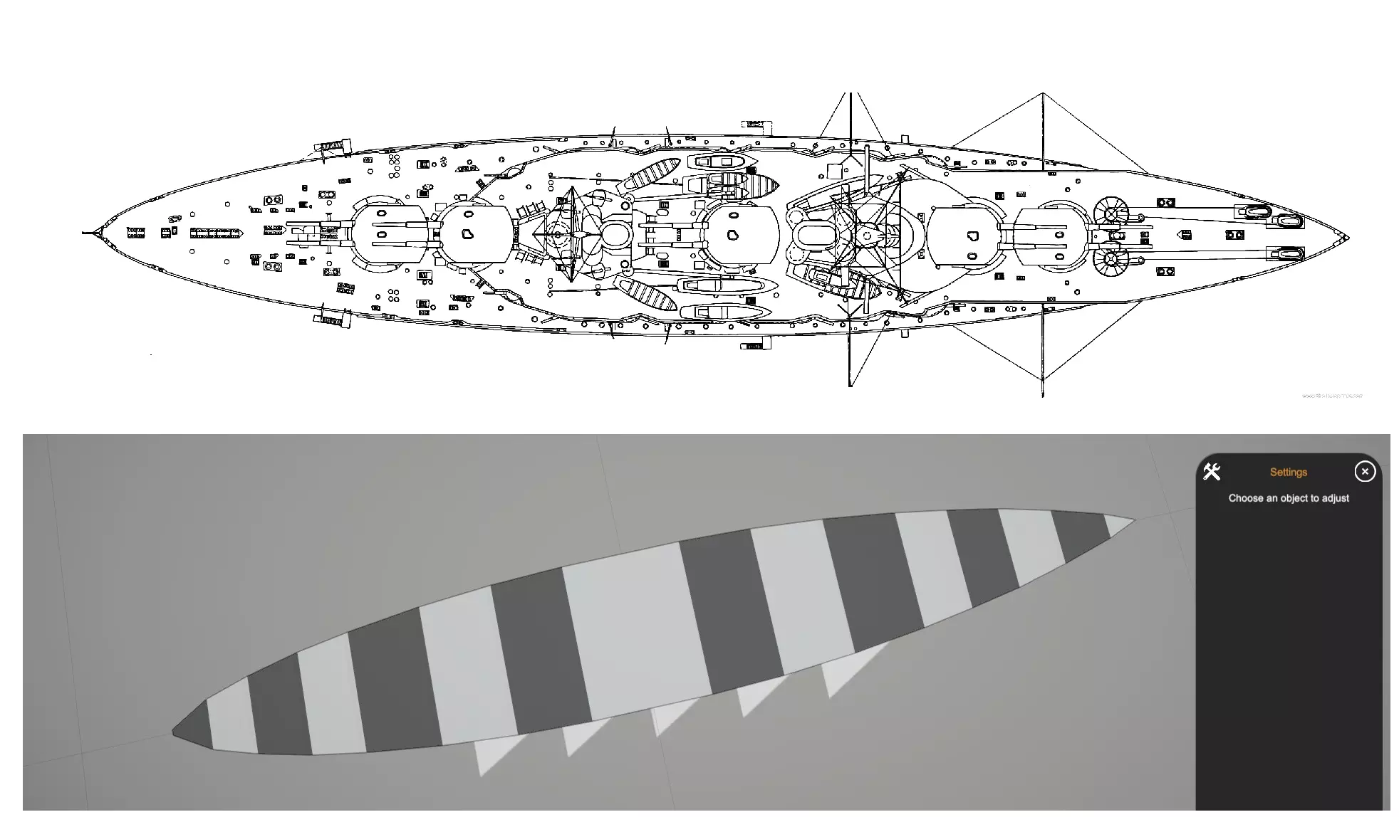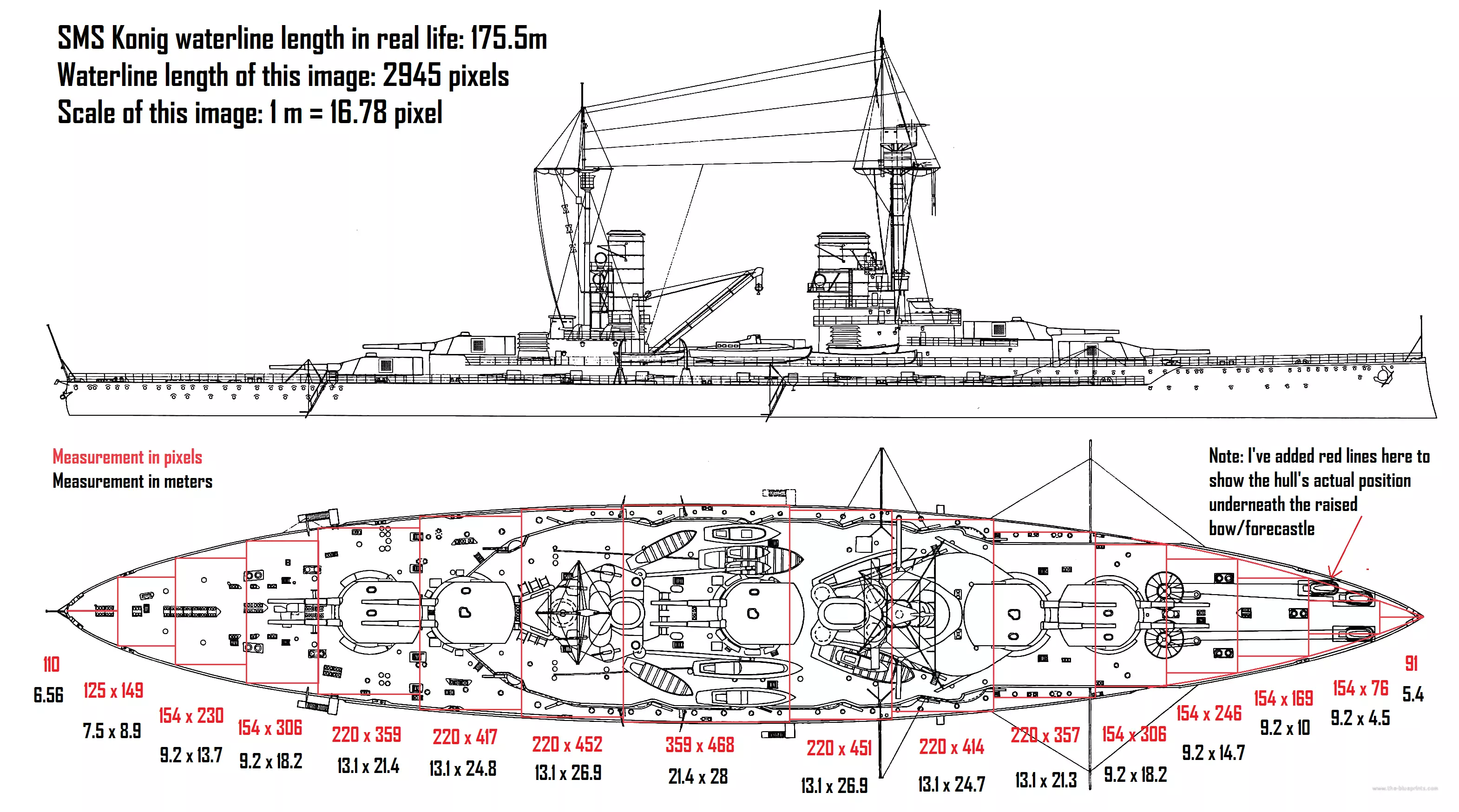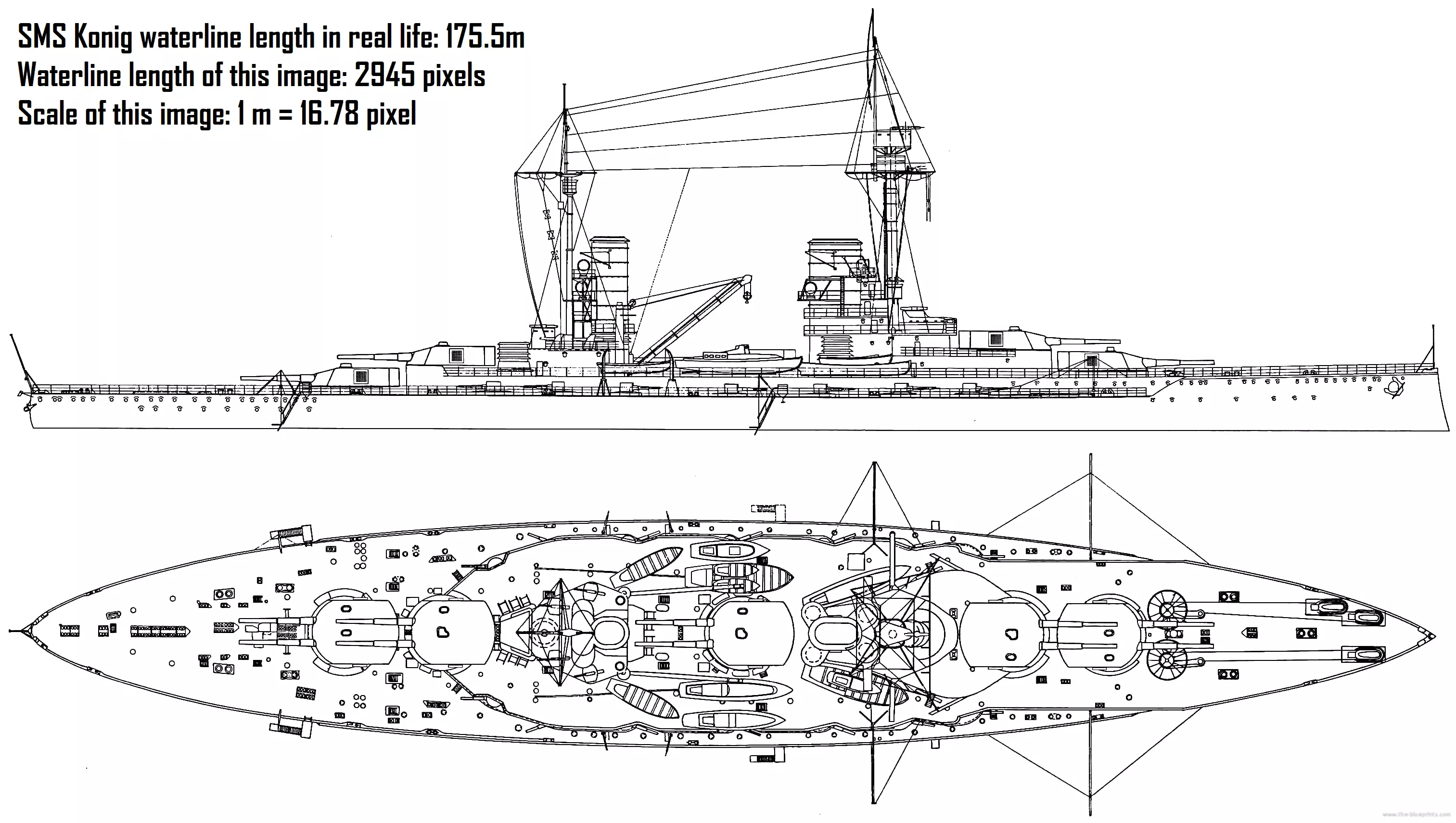 我们开始复刻舰船的流程是先在网上找到一艘现实中战舰的蓝图。这张SMS Konig的图片就很理想,它展示了舰船的俯视图和侧视图,清晰可见的线条勾勒出船体的整体形状。作为一艘一战时期的无畏舰,它的设计相对容易复刻,拥有简单的椭圆形船体和较为简洁的上层建筑。 使用画图软件、Photoshop或任何你有的软件来计算图片的比例。例如在这张图片中,Konig的船体长度为2945像素,而该舰现实中的长度为175.4米。2945除以175.4得出这张图片的比例为1米=16.78像素,记住这个数字。