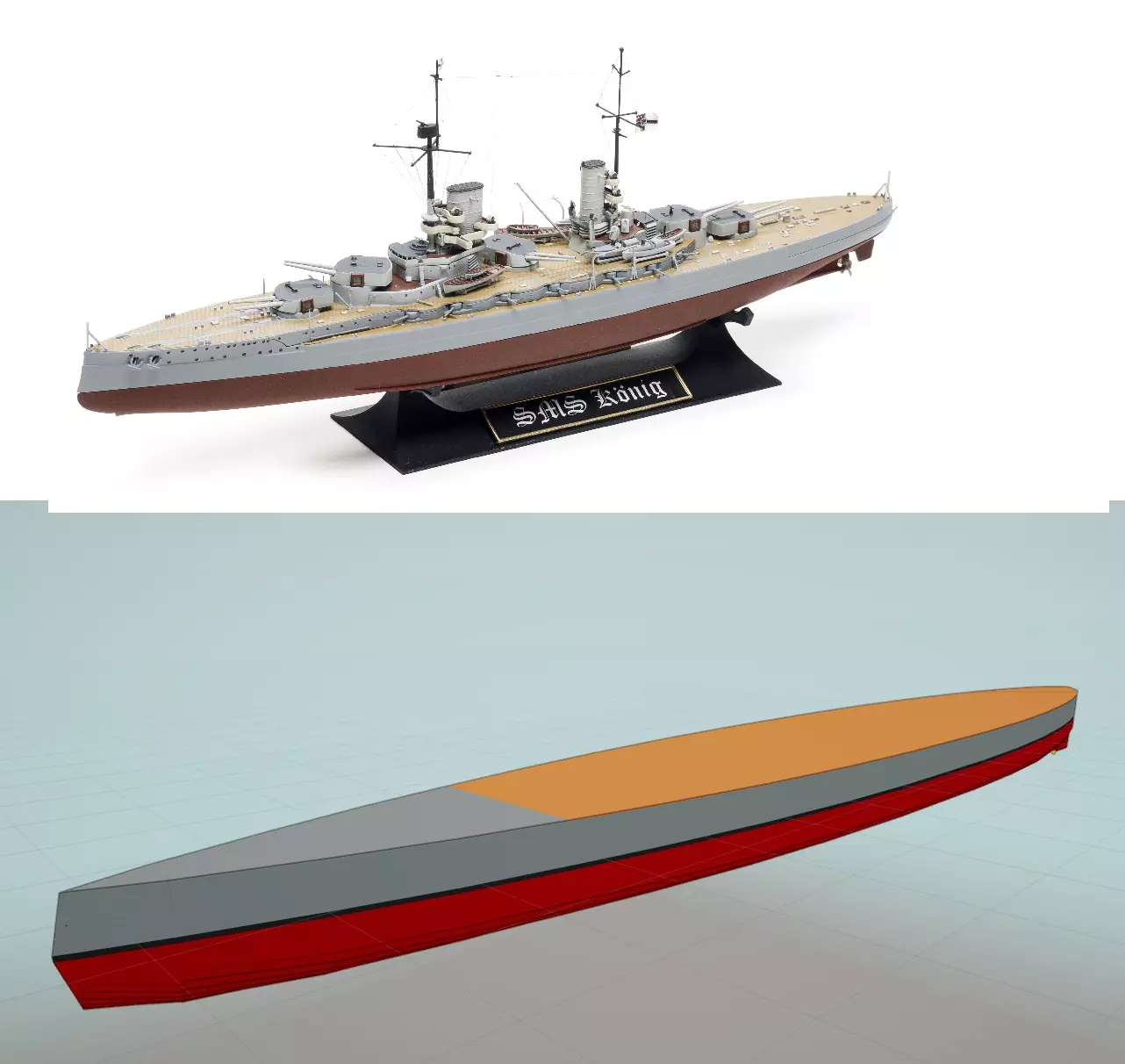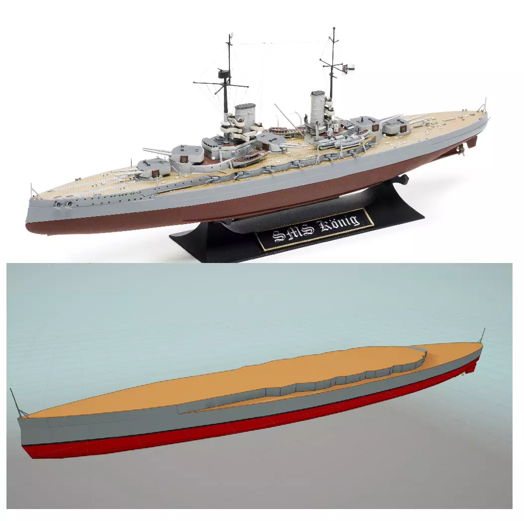 通过相同的像素测量方法,我估算出船体水上部分的高度为3.8米。此图未显示舰船的水下部分,但维基百科显示其吃水深度为9米。然而,截至2022年,《海军艺术》的浮力/重量计算存在问题,游戏内的排水量数值往往比现实中的实际数值高出50%-90%。因此,游戏中显示这艘国王级战列舰的排水量为32,000吨,尽管对于这种尺寸的舰船,其实际排水量应在26,000吨左右。我还将吃水深度(水下部分的深度)从9米减少到6.4米,以使舰船在水面上的高度处于正确位置。 这就是船体的样子,上方3.8米的部分为灰色,水下6.4米的部分为红色。我还添加了一个小的0。3米长的船中部涂成黑色以代表水线。参考SMS Konig建造上层建筑。