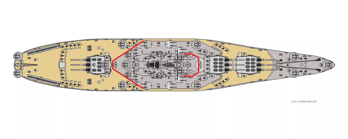 这里用红色勾勒出了南达科他号的上层建筑。注意其前后两端呈楔形,这为炮塔向两侧旋转提供了更大空间。 5. 历史上,老式战舰设计通常有多个烟囱,而较现代的设计烟囱数量较少但尺寸更大。例如,20世纪10年代建造的伊丽莎白女王级战列舰有两个烟囱,但到1930年被重新设计为一个巨大的烟囱。20世纪10年代的切斯特级巡洋舰有4个烟囱,而20世纪40年代的克利夫兰级则有2个。不要在烟囱正后方放置任何东西,因为在现实中它们会被烟雾和煤烟覆盖。 使用参考资料建造船体 - 国王号战列舰(SMS Konig)