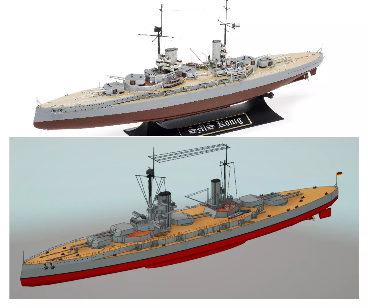 现在已添加舰桥、桅杆、小艇和装饰物品。由于这些物品相对较轻且体积较小,此阶段的建造不会对舰船的性能和平衡性产生太大影响。游戏内已完成的国王级战列舰与我在网上找到的模型进行了对比。