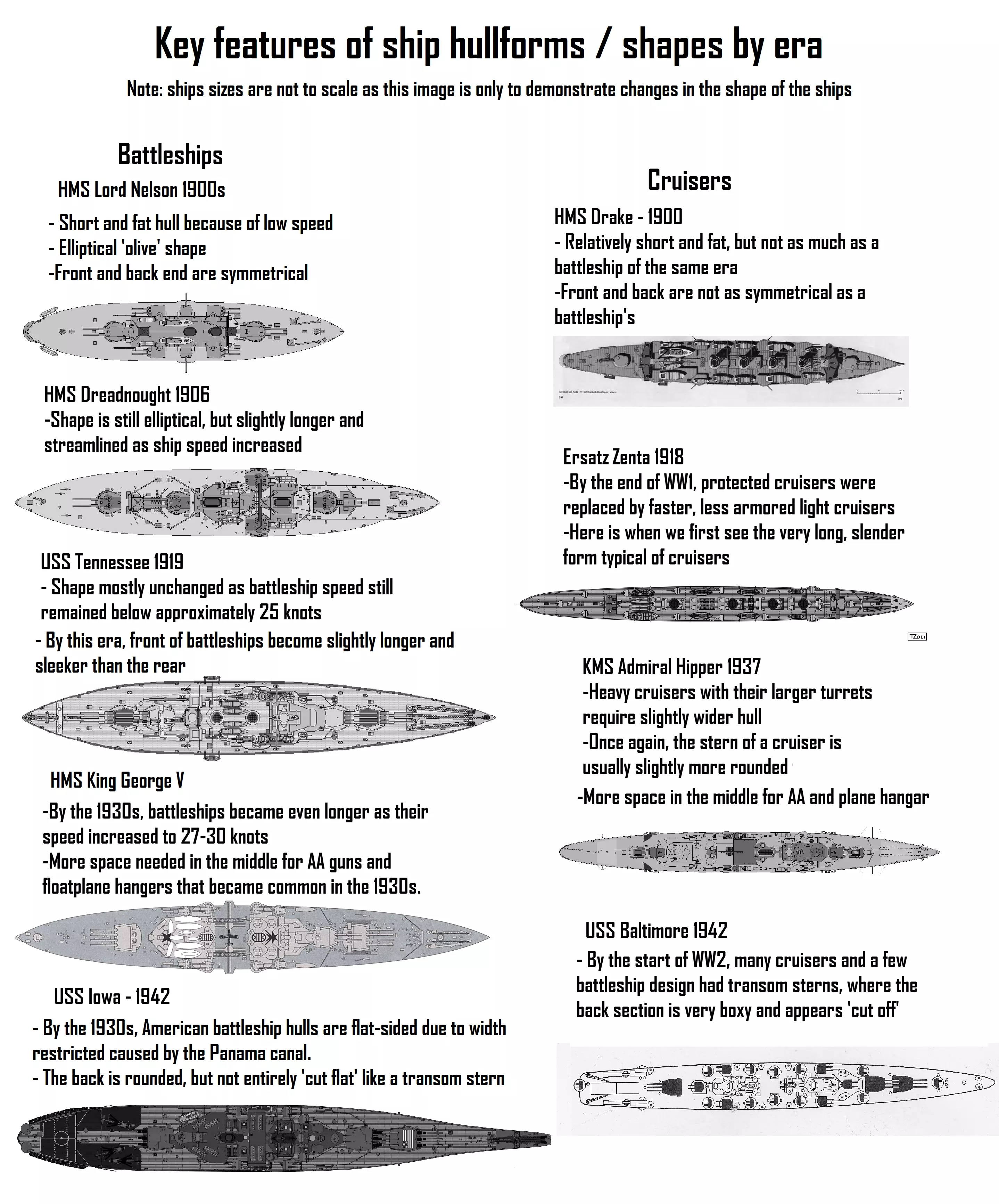 本指南旨在教你如何打造具有现实外观造型的舰船,其设计灵感来源于真实世界的舰船。本指南重点介绍20世纪初期(1900年代至1940年代)的舰船,但其中的通用规则和原理适用于包括现代导弹武装舰船在内的任何舰船设计。 第一部分将介绍舰船船体形状、造型和风格的总体设计原则与指导方针。 第二部分将以德国帝国海军国王号战列舰(SMS Konig)为例,演示如何在游戏中精确复刻真实世界的舰船设计。 按类型划分的船体形状与造型。