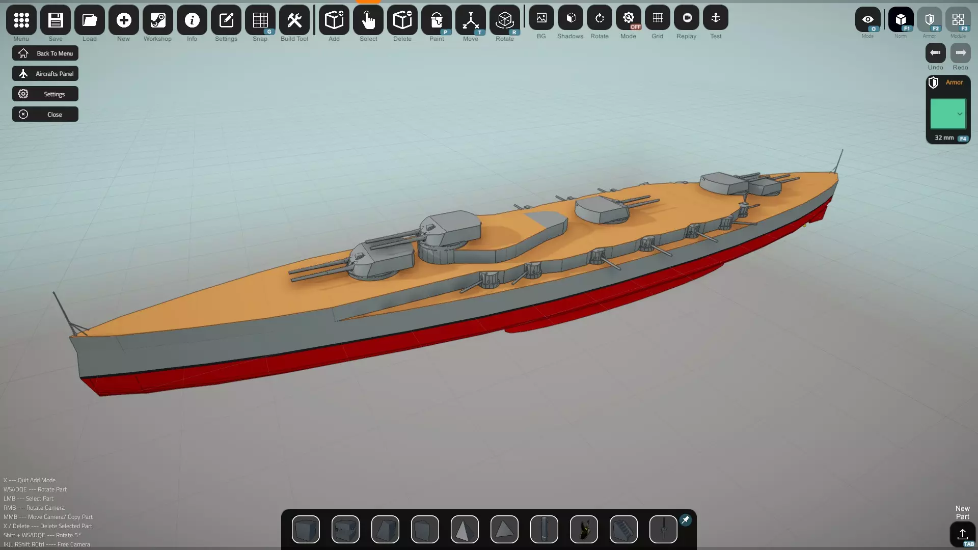 现在添加你的主炮和副炮炮塔。记住,你可以使用像素/米比例来计算炮塔的放置位置。以国王级战列舰为例,其一号炮塔的中心位于舰首正前方41米处。你可以创建一个41米长的方块,并将其用作测量工具,以确定舰首后方41米的确切位置。 此时,你已经添加了舰船的所有主要部件,因此可以进行试航,查看舰船的平衡和重量是否正常。如果船体在水中看起来浮得过高或过低,现在是调整装甲值并修正此问题的时机。但请记住,截至2021年初,装甲和重量值的计算完全不正确,装甲重量的计算是基于方块体积而非表面积。不要期望能安装符合现实的装甲厚度。