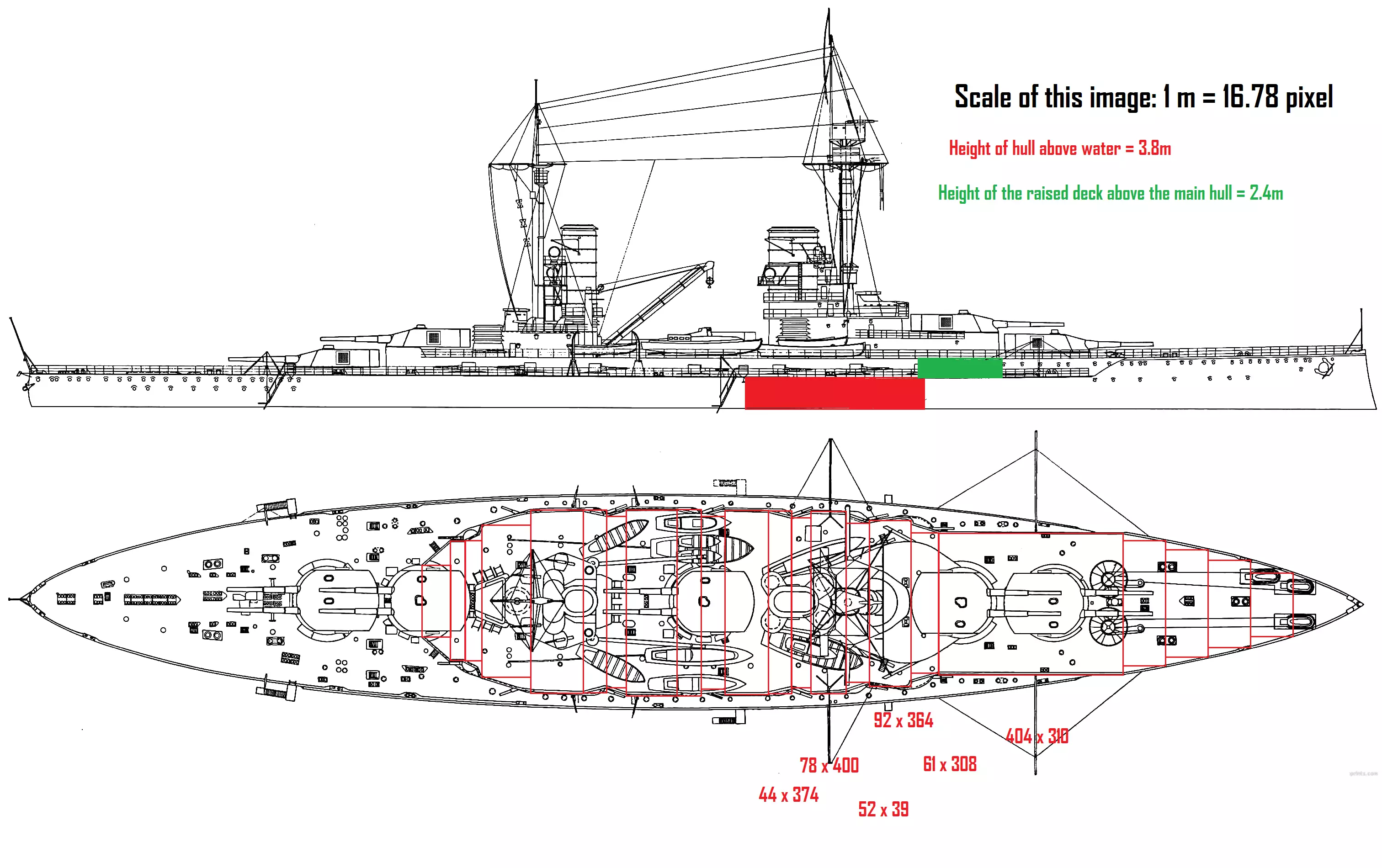 接下来我们来处理上层建筑,也就是位于覆盖全船长宽的“主”甲板之上的部分。在许多一战时期及更早的战舰上,包括这里的国王级战列舰,通常会有一个较小的升高甲板。在此处,我用绿色标出了这部分升高区域,并估计其高度约为2.4米。接下来我们再次应用像素测量技术来复制升高甲板的形状,注意所有供炮廓式副炮旋转的三角形“凹槽”。