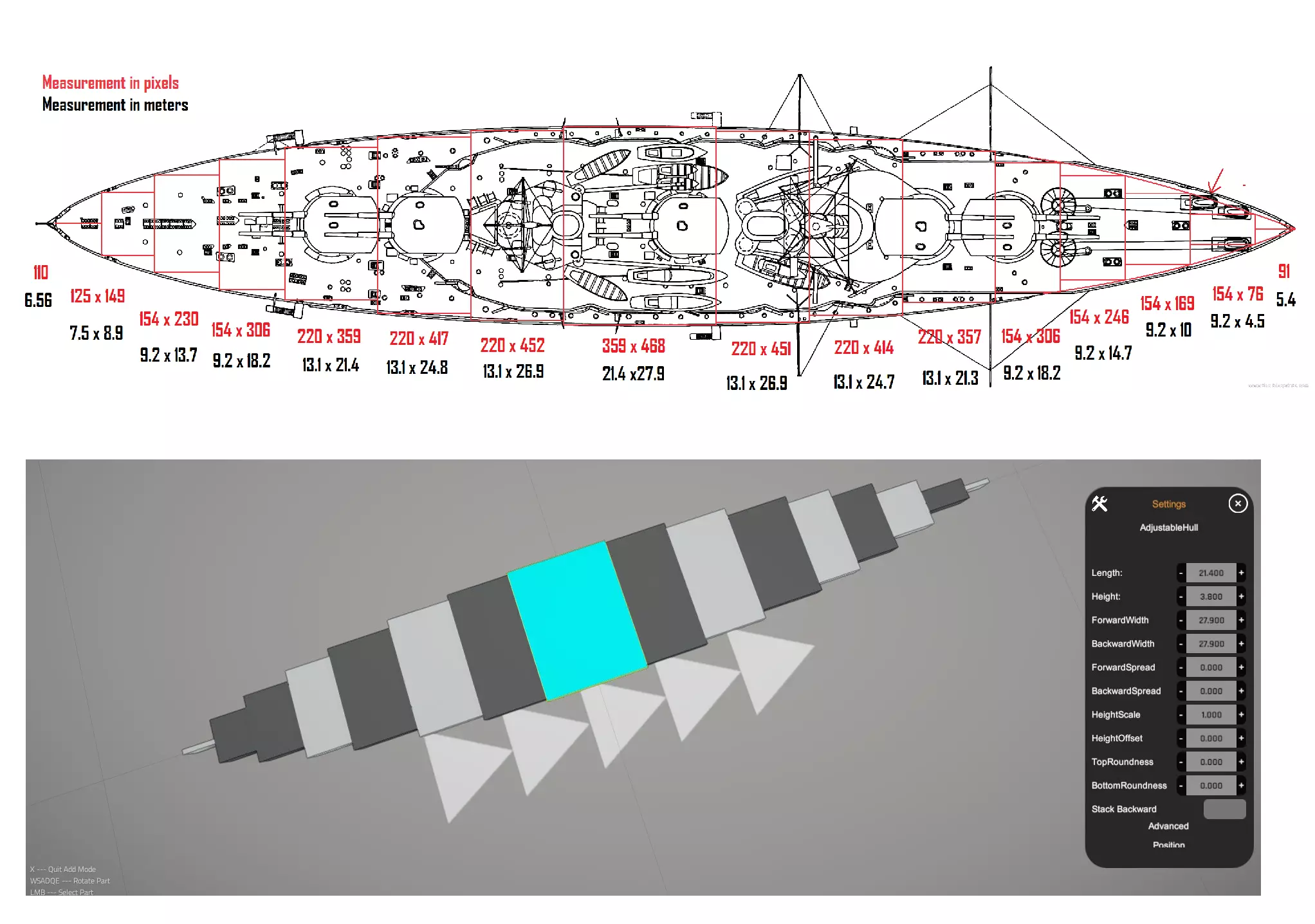 接下来,将船体分割成一系列矩形,并记录它们的像素尺寸。(在画图软件中绘制矩形时,其像素尺寸会显示在左下角)确保矩形之间不重叠,并且完全延伸到船体的外边缘,以获得最高精度。之后,使用16.78这个数值将像素测量值转换为米制测量值。这个过程可能有些繁琐,但现在你已经获得了极其精确地复制一艘船所需的数值。