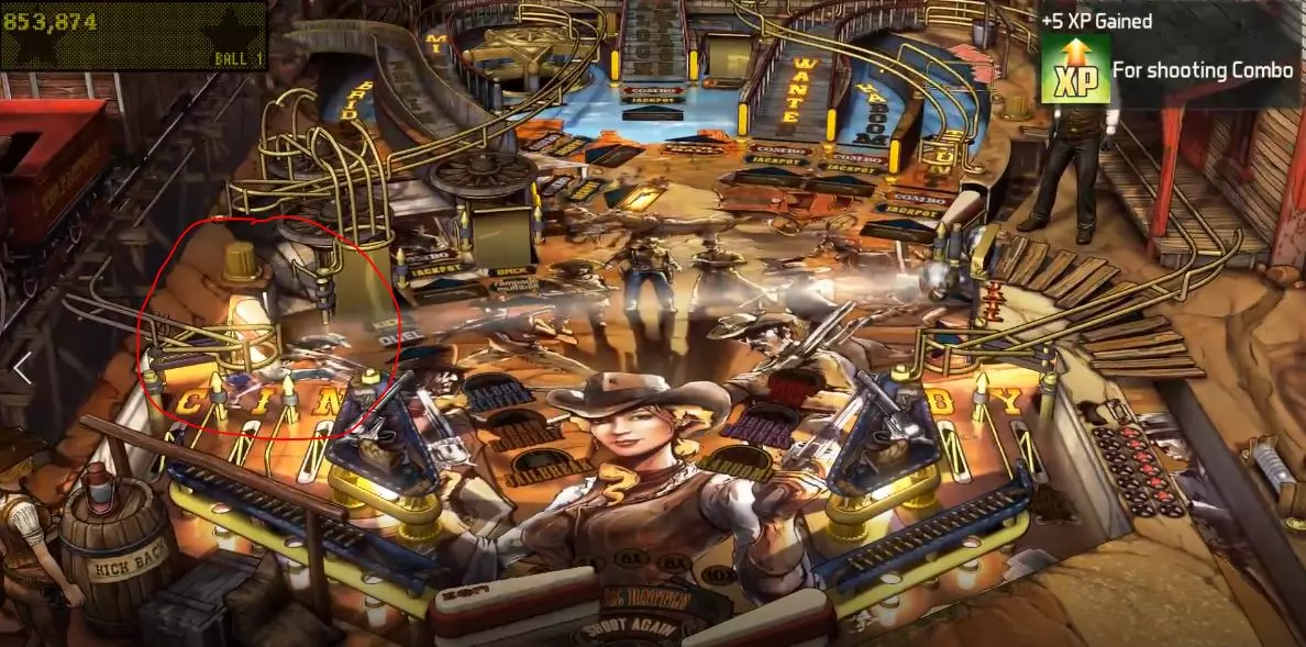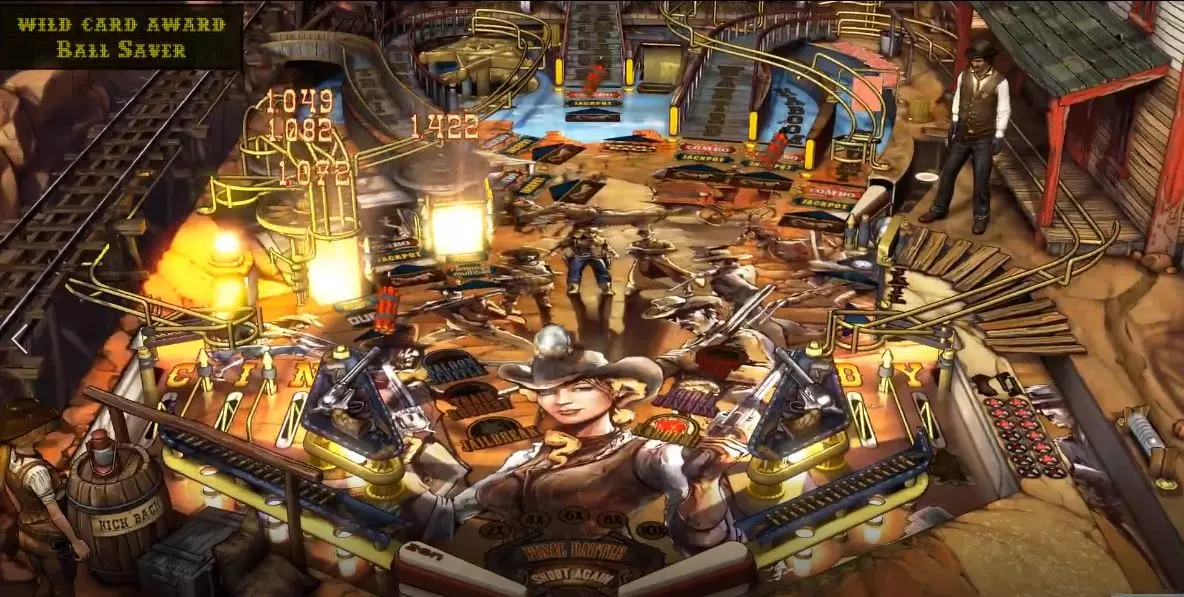 上面有三堆雷管,全部击中后要再次击中【1422】那里的牌子才能让辛蒂按下起爆器,炸毁火车铁轨。 【神枪手事件】:需要击中地图右侧那四个圆形图案,击中四次后才能触发。第一次触发会获得两个弹珠,之后再次触发会获得三个,以此类推。主要方法是用左侧上方的弹射装置来触发,通常四个圆形图案中有两次需要通过这个装置来完成触发。此外需要注意的是,在一些桌面事件中,该区域有时会处于冷却状态,即便击中也只能加10000分,无法激活圆形图案。 决斗:即辛蒂与恶德警长互殴,并成功击倒他,成为新警长。触发条件非常繁琐,迄今只成功击倒过一次警长,具体加分数也不清楚。一般这个桌面事件都属于听天由命。 炸药桶:需要击中地图上方房子那个【Rampage】字幕旁的小牌子五次。那个小牌子下面是个炸药桶图标,每次击中都会给图标充能,充满就可以触发炸药桶事件,一个炸药桶100000分。 通缉令:拼出桌面上的【Wanted】就可以触发,一共有十个劫匪通缉令,每个劫匪的赏金不同,譬如娃娃脸是5000分,疯狗是10分……最高那个劫匪是1000000分。 劫掠火车:就是把弹珠弹到火车车厢上。一共三节车厢,本人最多到达第二节,地图比较小,不太会玩。左轮枪上弹:与神射手事件类似,是一个高分的累积奖励,不过需要拼出桌面上方的【RAMPAGE】字样。整个过程相当漫长,和与警长决斗一样,基本都要看运气。 监狱事件:拼出桌面最右侧的【JAIL】,这四个字母就在神射手的四个圆形图案下方,呈红色。监狱事件其实是最划算的,许多桌面事件都需要它,而且在拼字母的过程中还能触发其他事件。触发监狱事件后,桌面会陆续出现三个劫匪图标,击中一个奖励100000分,击倒全部十个劫匪后,最终会奖励1500000分。