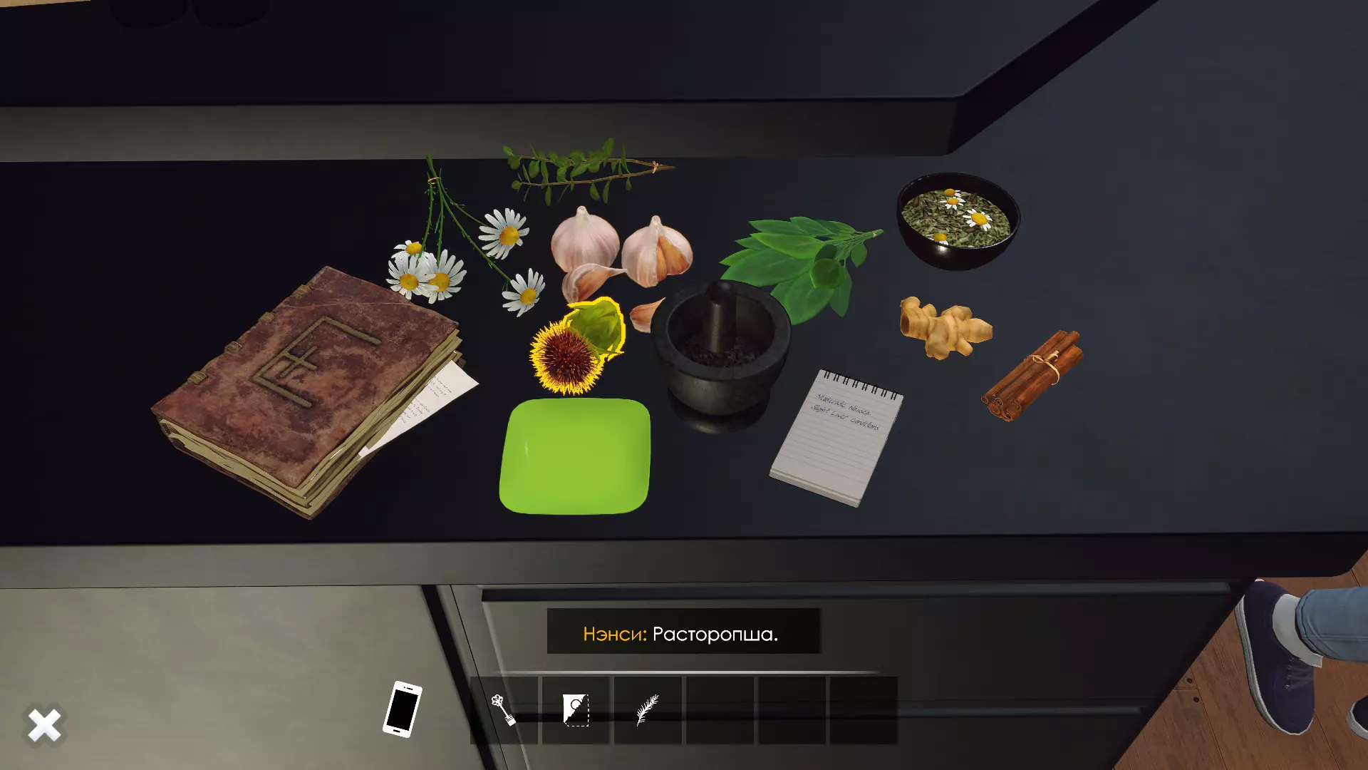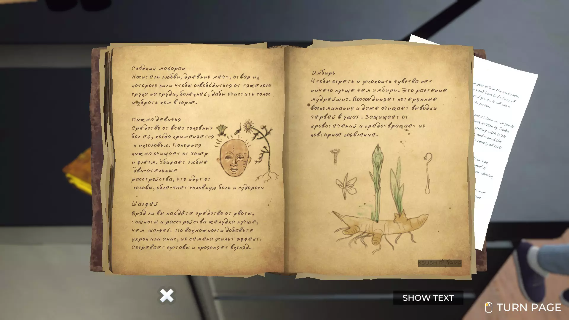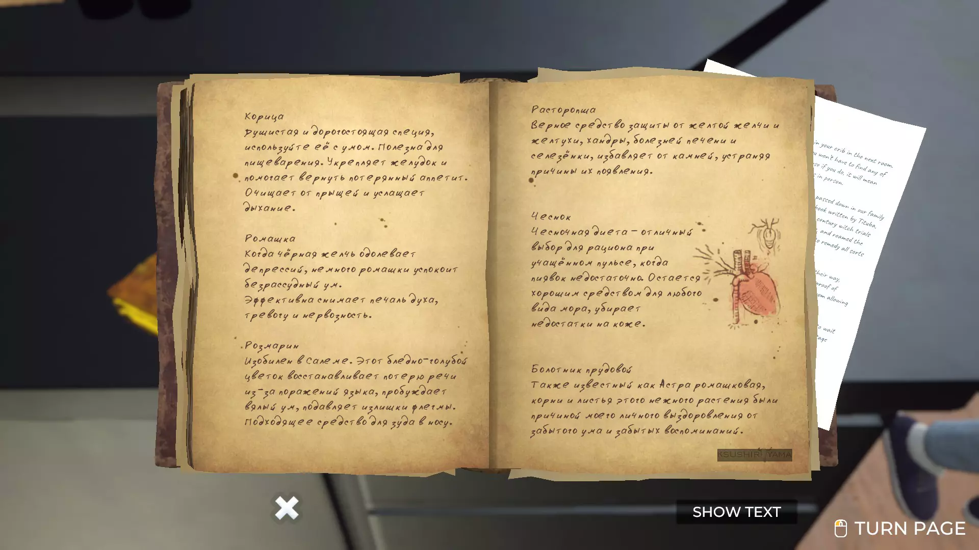洛伦商店小游戏指南。俄语版《提图巴的魔法书:草药与技巧》。 草药指南 要开始制作草药混合物,需要注意以下几点。 首先,书中有关于Starwort(池塘水芹)的记录,但桌上没有这种草药。我不确定游戏中是否存在这种草药,至少我没遇到过。如果你碰巧找到了它,我认为处理它的方式应该和处理迷迭香一样。 其次,需要获取迷迭香,桌子上也没有。可以在前往哈托恩家的路上,在森林里的树下采摘它。