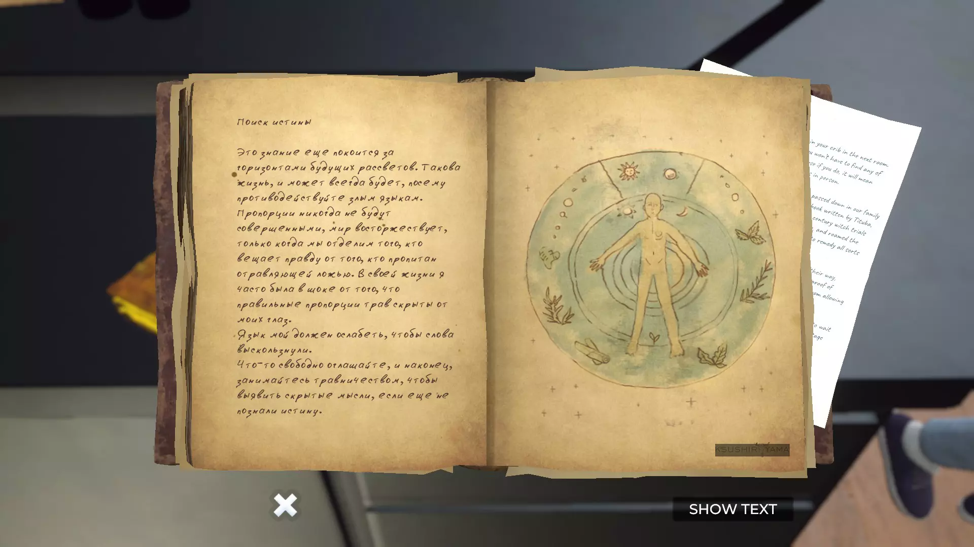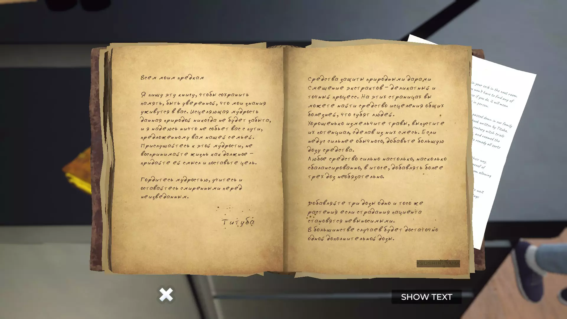 这个谜题不会影响剧情走向,解不解决都不影响你通关游戏。(我第一次玩的时候就完全没做过任何药剂)不过,它能增添游戏氛围,我实在不忍心跳过。台阶右边放着一个白色笔记本,上面写着各种疾病症状。你需要根据书本内容挑选能够缓解这些症状的草药,按照蒂图巴的说明,总共需要2到3种草药。若因胃部不适或恶心,可选用对消化有益的草药;若头痛,则选用能缓解头晕、意识模糊等症状的草药。 若只有一种症状,药方由三份相同的草药组成; 若有两种症状,药方由两份针对中度疼痛的草药和一份针对轻度疼痛的草药组成; 若有三种症状,则放入三种不同的草药各一份。