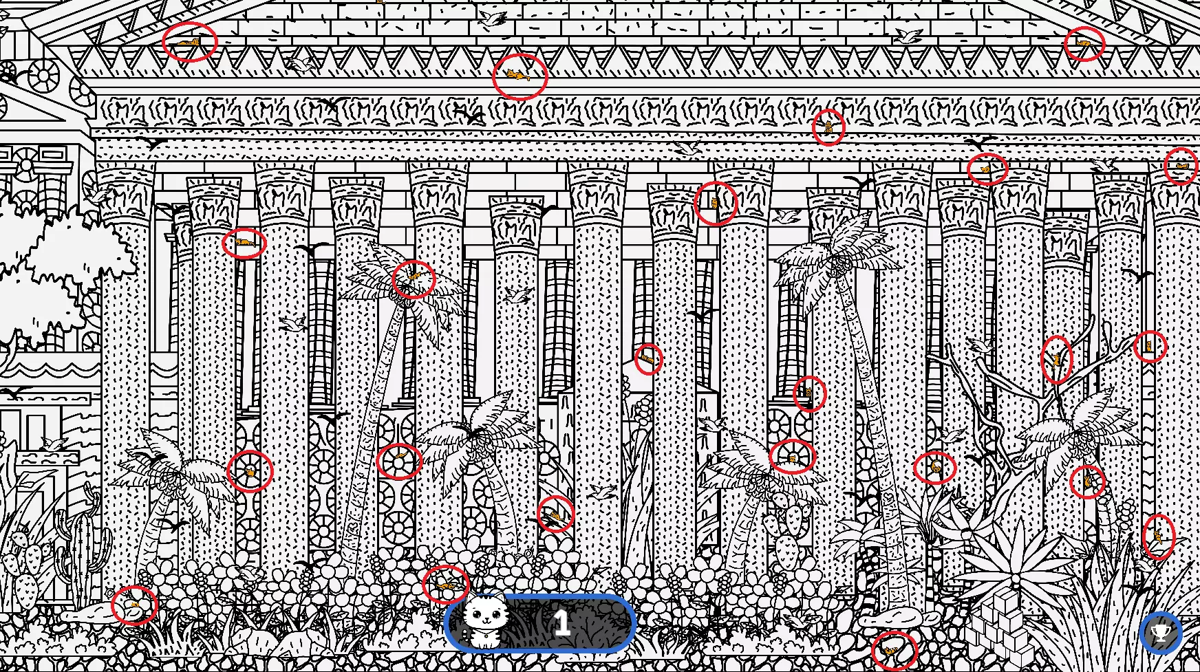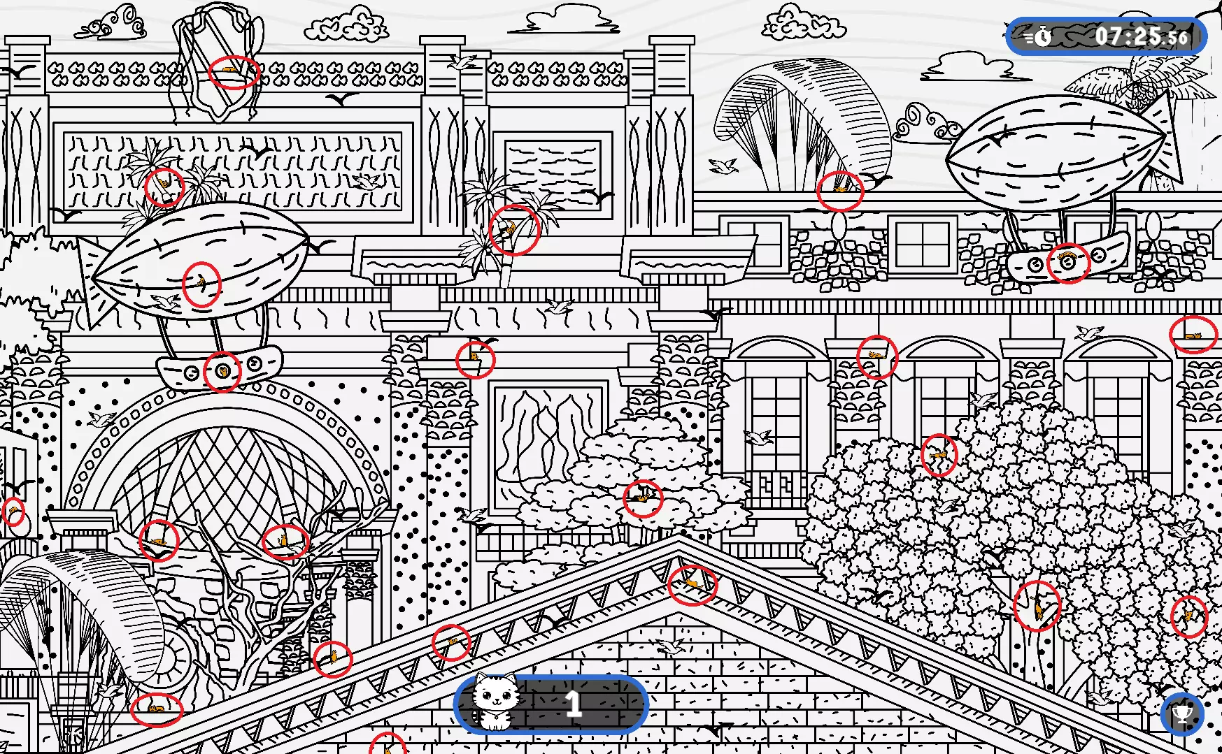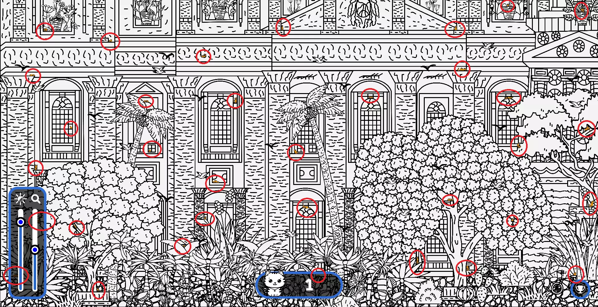 大家好, 本指南旨在帮助大家找到所有隐藏的猫咪。有些猫咪很难被发现,所以如果你在寻找遗漏的猫咪以完成游戏,欢迎使用本指南或参考一下。能保证100%解锁成就! 祝玩得开心! 猫咪的所有位置 注意: 1) 最后一只猫咪在绿色圆圈内。 2) 请注意,有些猫咪隐藏在用户界面和计数条后面。这些猫咪也已用圆圈标出。 左侧
