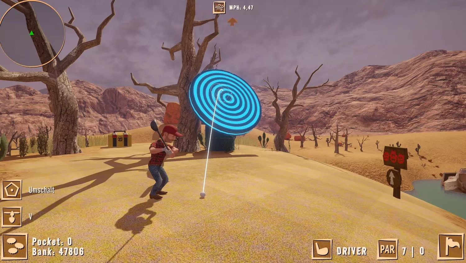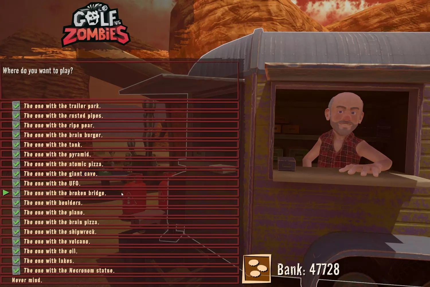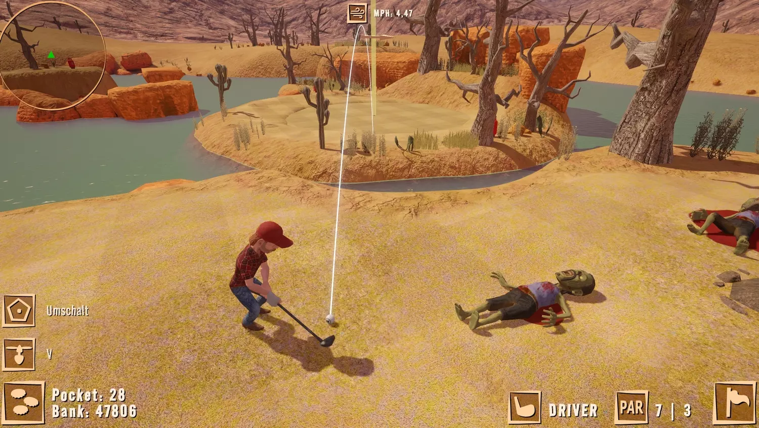 击杀僵尸 当球落地后,一些僵尸会在你周围生成。别着急,把它们全部消灭。最好能用一枪爆头解决每个僵尸,这样射击次数就不会计入你的总击球数。 当所有僵尸都被消灭后,尝试到达截图所示的最后一个岛屿。高尔夫球应该落在洞口附近……甚至直接进洞。