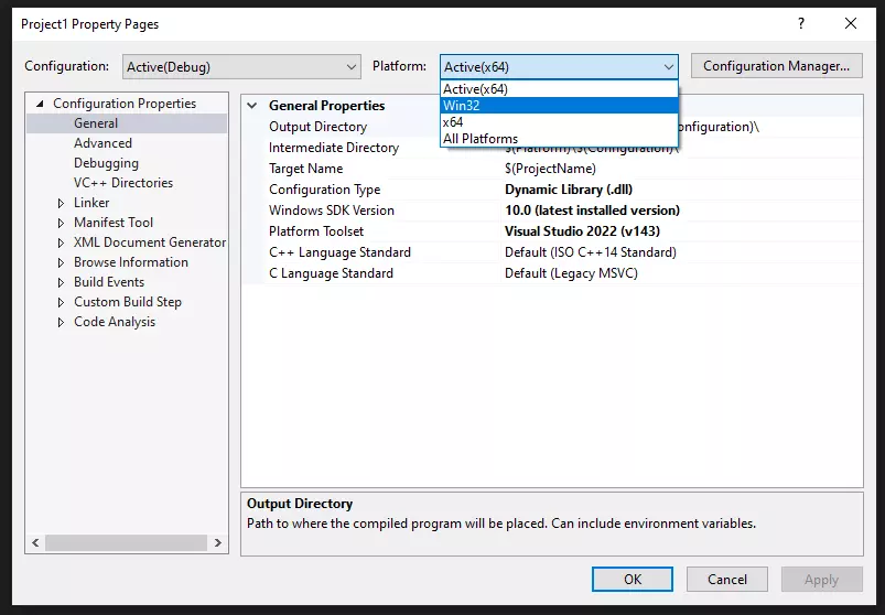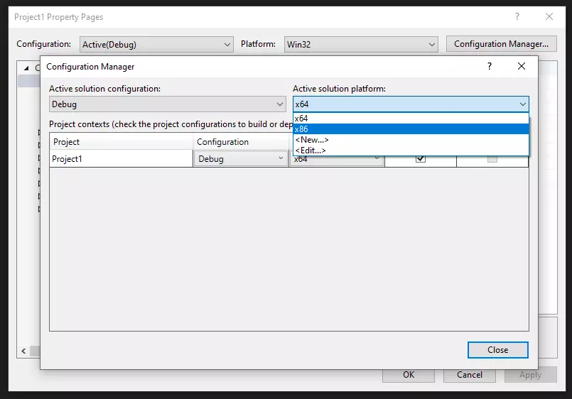 默认情况下很可能已设置为x64,因此请确保不要跳过此步骤。现在点击配置管理器并重复此步骤,确保同时更改项目配置。