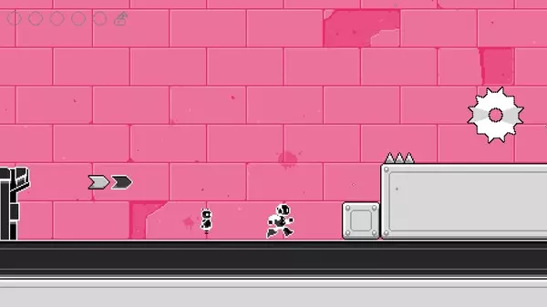 这是像素风平台跳跃游戏《Monochrome Heights》的视频介绍,展示了机器人Happy在不同关卡场景中,躲避尖刺、小怪等障碍,进行跳跃闯关的玩法内容。