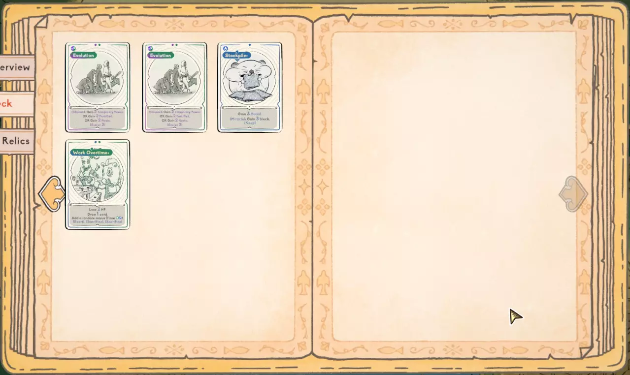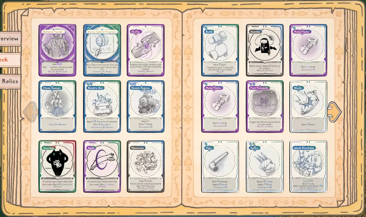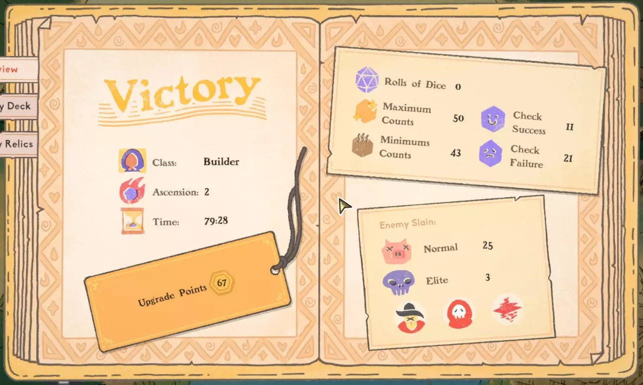 遗物 遗物非常有用,一定要获取。 不过说真的,我觉得能让构筑变得极为强力的遗物并不多。我建议尽可能多地停靠宝箱来获取遗物,但这里的遗物之间并没有太强的协同效果。 通常情况下,遗物能帮助你赢得对局是因为你可以用【唯一骰子】来改变它们,但在这里不行! 任何能帮助你存活到牌组成型,或者提供法力值的遗物都很不错。 总结 希望本指南能帮助你轻松获得该成就。 如果你有任何建议,或者在按照我给出的步骤操作时遇到任何问题,请告诉我。 谢谢! 这是我在2级进阶难度下获得该成就时使用的最终牌组。