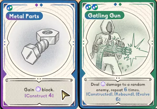 建造者(紫、绿、蓝)旨在通过打出大量卡牌来配合构装体并进化以实现成长。 卡牌方面: 原则上,《骰子奥术师》的核心在于改变数字。在本次游玩中,你仍然可以使用改变数字的卡牌和骰子,只是需要去寻找它们。本次游玩我们最依赖的机制是进化。 通过进化,我们将能够获得远超击败 Boss 所需的成长。 我想为这套卡组展示的卡牌是金属部件。金属部件是一张中等稀有度的卡牌,在大多数游玩过程中都能获得。我们的目标是完成构建,然后尽可能多次地触发加特林机枪的效果。