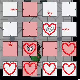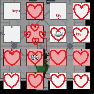 当前位置=你当前所在的位置。 钥匙=钥匙的位置。 面板=面板室的位置。 小方块=表示每个房间的门。 前往面板室 进入每个房间前,你需要先解锁通往钥匙房间的门。你可以通过前往面板室来激活它。方法如下: 从起点开始,你需要向左走。 然后,你需要向上走。 现在你到达了控制室。 将房间向西移动。 然后,向下走。 然后,向左走。 你到达了另一个控制室。 将房间向东移动,两次。 然后,向右走。 然后,向上走,两次。 现在你已到达面板室。 激活它。 到目前为止,你已经通过下图所示的心形标记清理了房间。