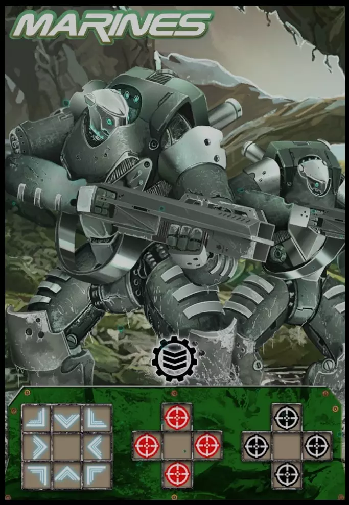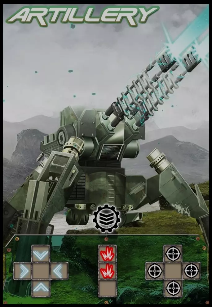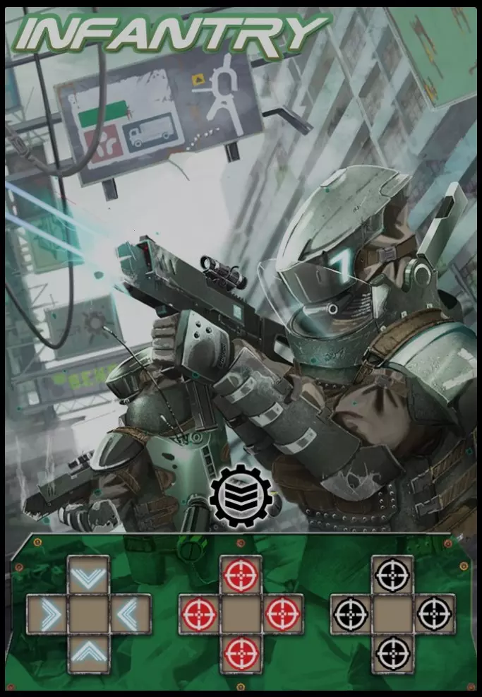 炮兵步兵是最普通的卡牌,其基本用途是纵向或横向占领相邻格子,并且在已建立火力支援的情况下攻击敌方卡牌。该卡牌的缺点是与部分其他卡牌不同,其示意图中没有对角线。该卡牌有升级版——【海军陆战队】。海军陆战队