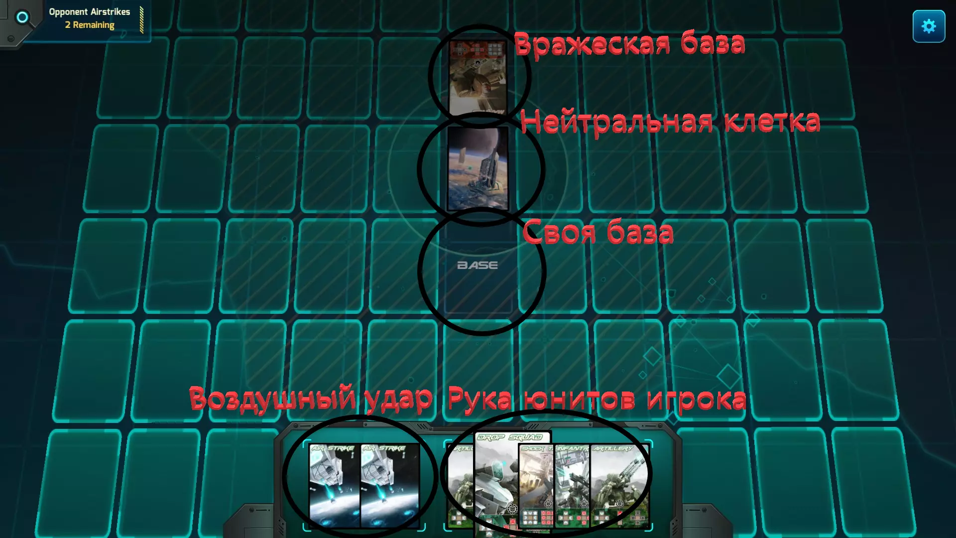 玩家会获得五张单位卡牌和两张【空袭】卡牌。我们可以弃掉最多两张卡牌,并从牌堆中抽取与弃掉数量相同的卡牌。 玩家回合包含两个阶段: 1) 玩家在首回合(由先手玩家进行)打出一张单位卡牌,在其余所有回合中则打出两张卡牌(单位卡牌或【空袭】卡牌)。每打出一张卡牌后,执行所有必要的行动。 2) 从牌堆中抽取与打出数量相同的卡牌。回合切换至对手。 游戏目标是占领敌方基地格子;若未能成功占领,且已使用完手牌中所有单位卡牌、所有【空袭】卡牌,牌组中也无剩余卡牌时,则计算双方场上的单位数量,单位数量较多的一方获胜。 单位卡牌 每张单位卡牌都有三个字段,用于定义其属性: