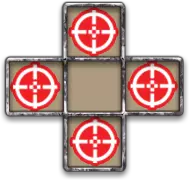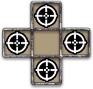 攻击方向。指单位卡牌可攻击敌方单张卡牌的方向。该字段中的简易准星表示,要消灭被攻击的单位,您必须在敌方单位相邻的格子中至少还有一张单位卡牌,通过火力支援示意图指向它。如果图表上显示有闪光,则表示所选敌方单位无需火力支援即可被消灭(【火炮】卡牌)。