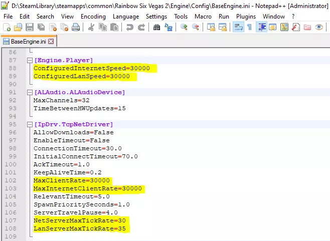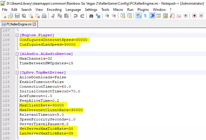 [引擎.玩家] 配置互联网速度=30000 配置局域网速度=30000 [网络驱动.Tcp网络驱动] 最大客户端速率=30000 最大互联网客户端速率=30000 网络服务器最大帧率=30 局域网服务器最大帧率=35 汤姆·克兰西的彩虹六号:维加斯2 凯勒游戏配置 PC凯勒引擎.ini