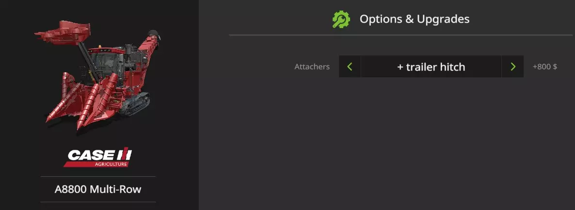 众所周知(或者说大家即将了解到),凯斯IH甘蔗收割机无法牵引更大的拖车。不过,我找到了两种能让凯斯收割机收割作业更轻松的方法。 简介 在《模拟农场17》铂金版中,游戏新增了甘蔗这一作物。随之而来的是用于这种新作物的利赛德品牌收割机(拖拉机牵引式)以及一款自走式版本——凯斯IH A8800多行数收割机。 在商店选择界面时,会出现以下选项: