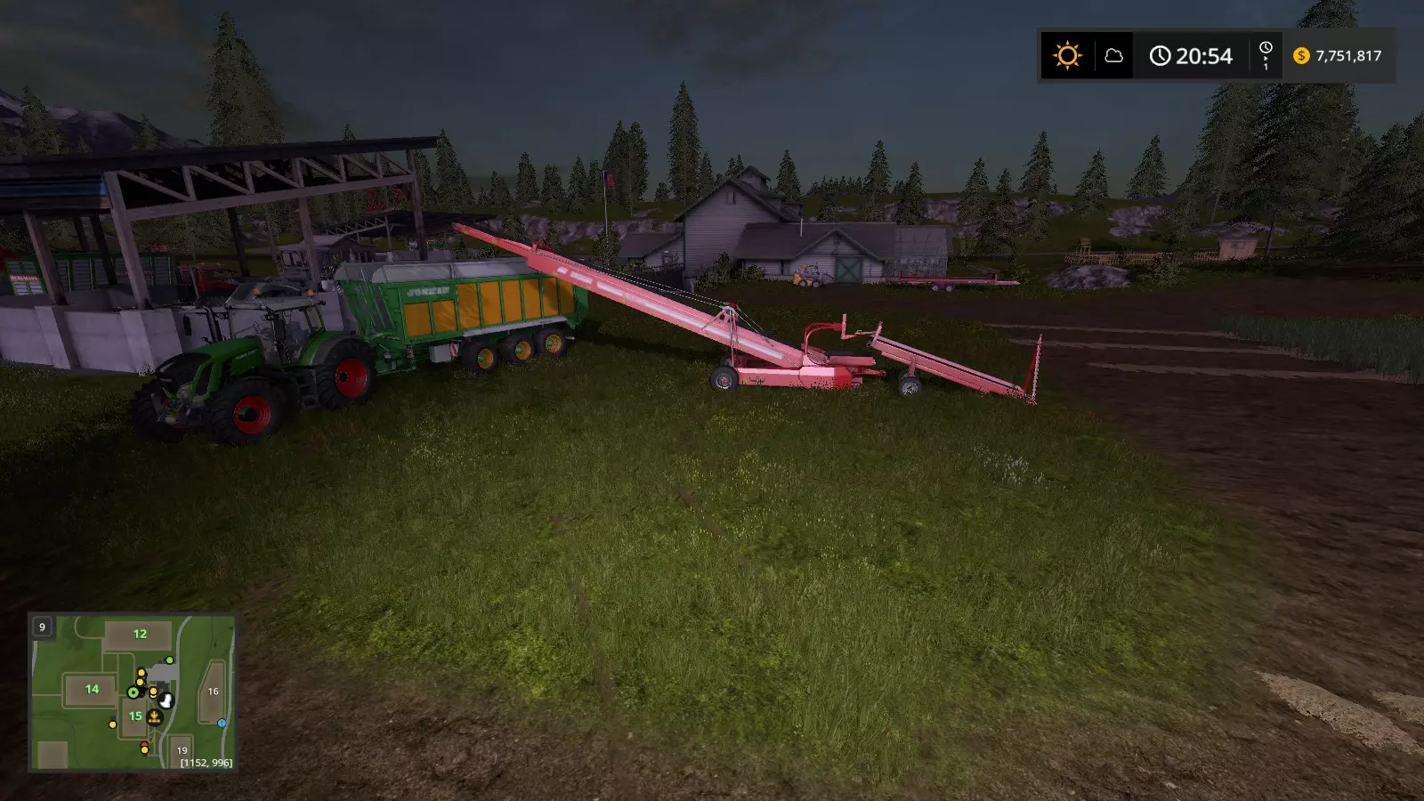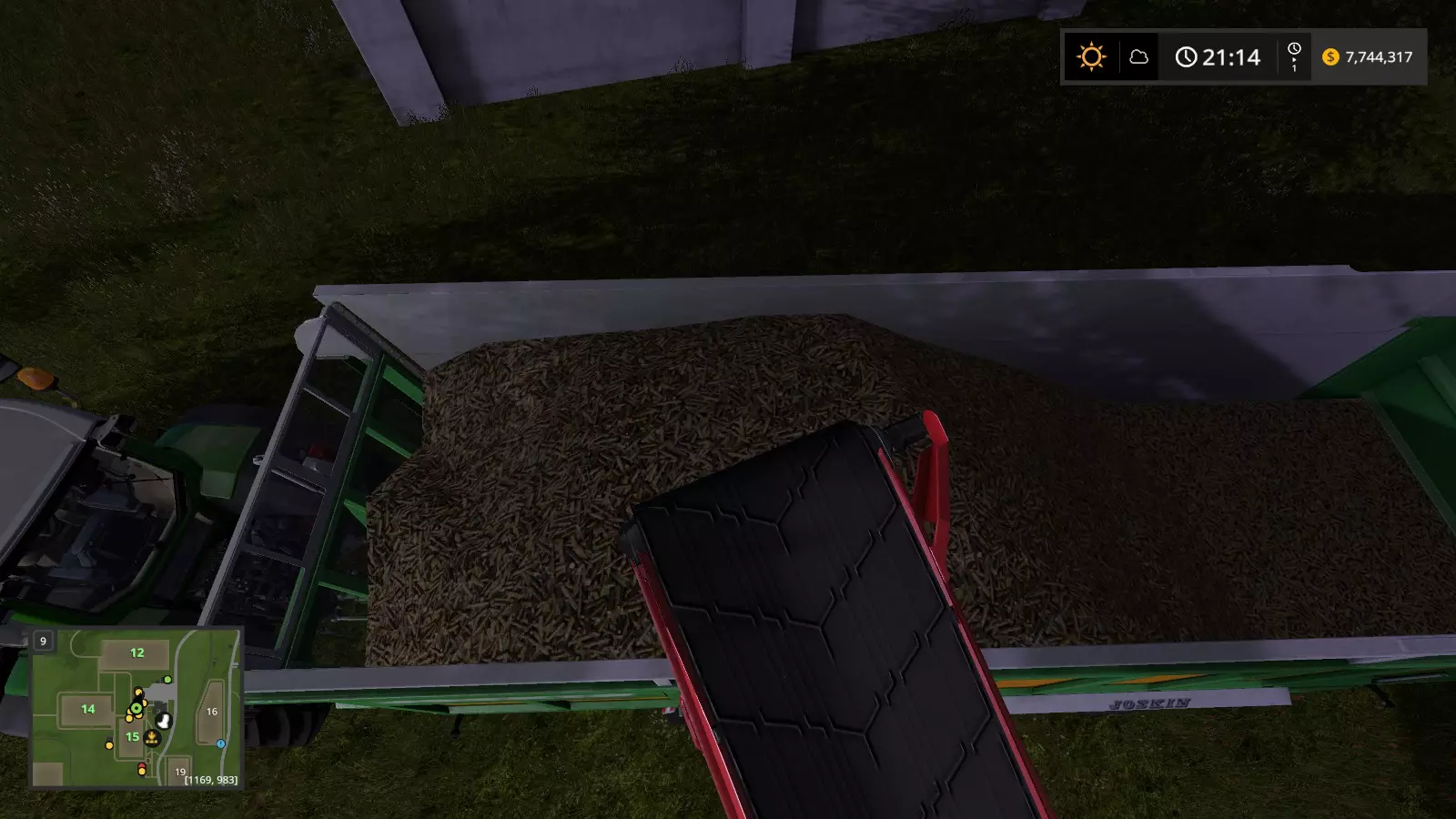 第四步:使用青贮摊平机(或其他能够推送谷物的工具)将地面上的甘蔗推送到传送带系统中(由于我忘记将时间进度调至60倍速,图片中可能难以看清)。