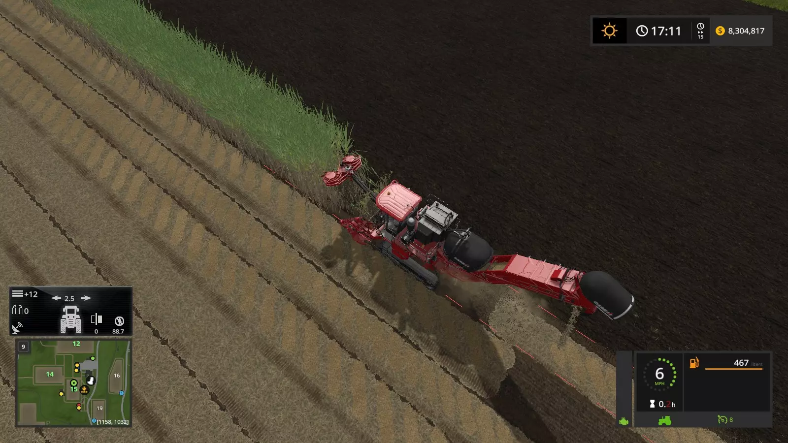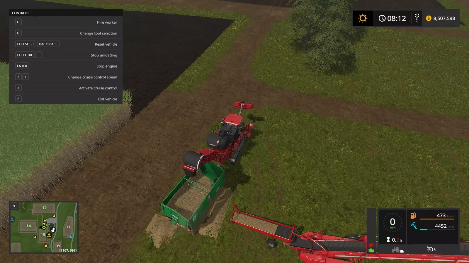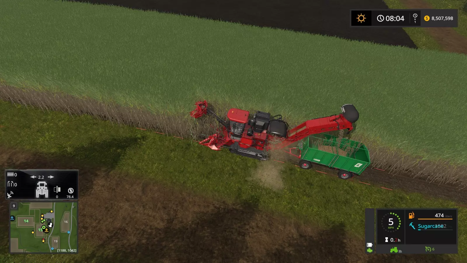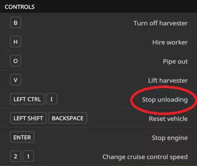 单人收割效率不高,对吧? 如果你想省点钱,不想雇佣工人,只想自己操作,我有个方法可以让你独自操作凯斯收割机,还不用那些又小又费力的拖车。 方法一 步骤1:获取凯斯IH A8800多行收割机(也就是自走式甘蔗收割机),并将其开到你的甘蔗地。展开机器后,不要伸出卸粮管。(如果已经伸出了,就收回来)。在控制菜单中,按住左Ctrl键并按I键(或其他提示的按键),开启将甘蔗直接卸到地面的功能(如下所示)。
