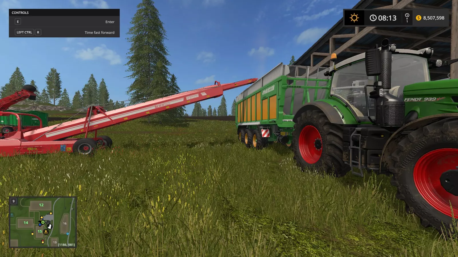 步骤4:在装满(或部分装满)拖车后,前往传送带系统,将甘蔗倾倒在蜥蜴传送带附近。确保在菜单中选择了正确的倾倒侧(按U键更改)。
