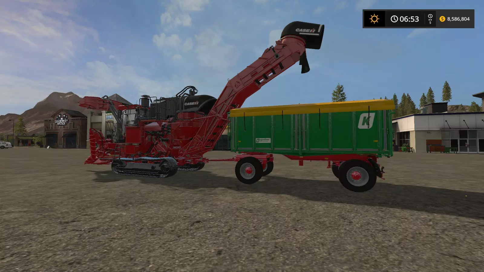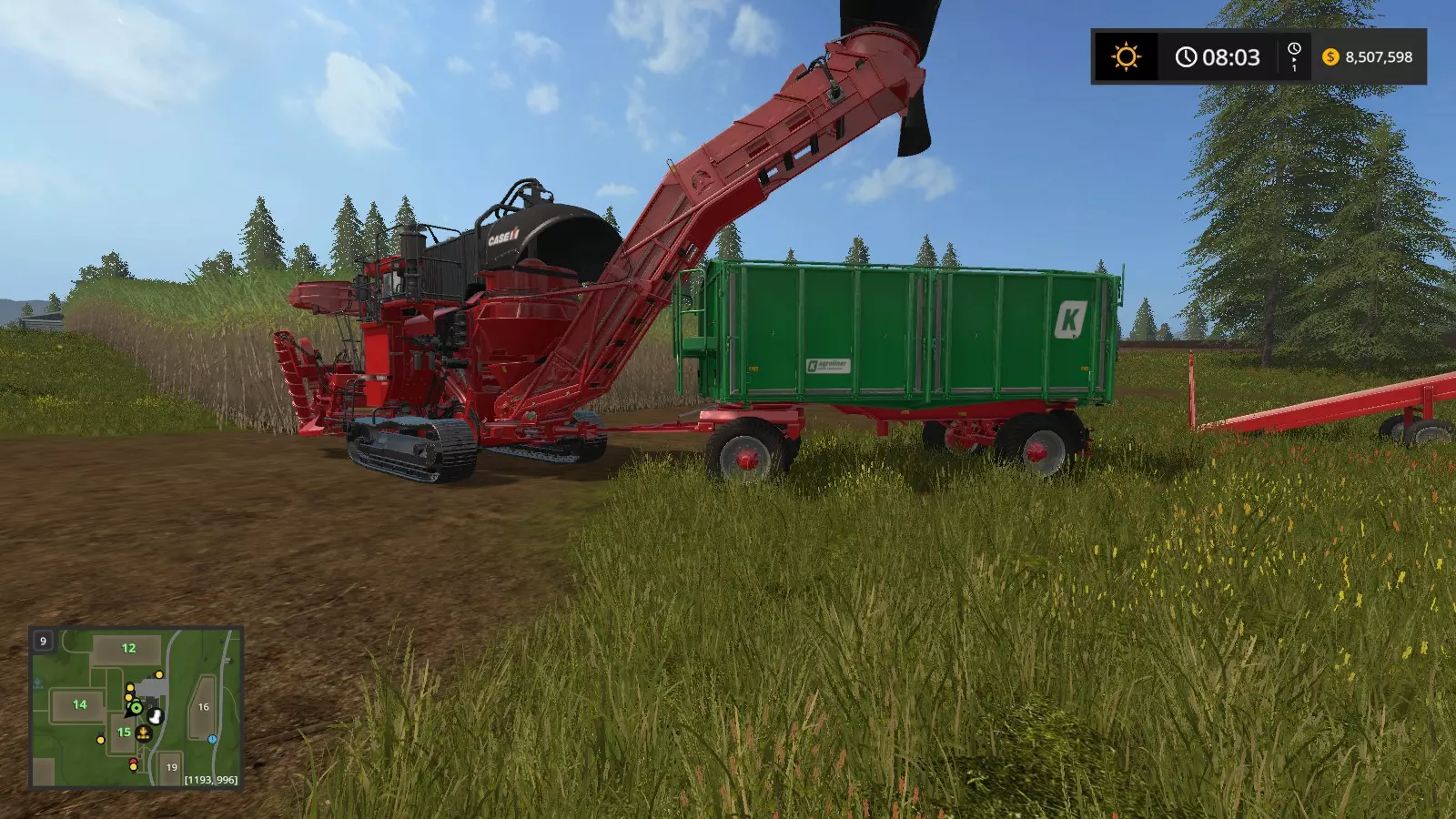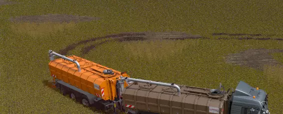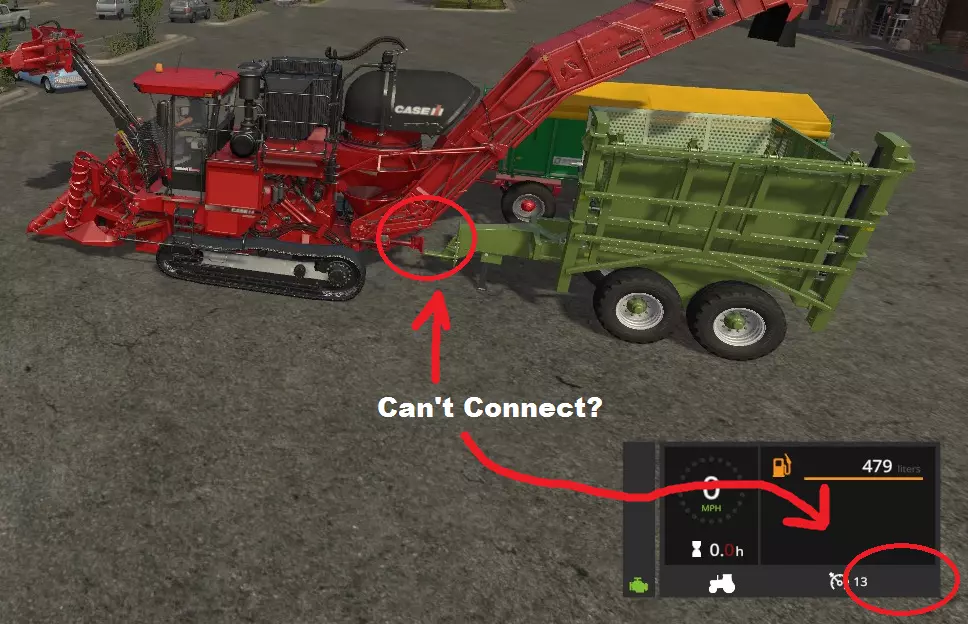 如果你确实想这么做,可以重复整个流程。 方法二 我发现了另一种方法,比第一种方法省力一些: 步骤1:将凯斯IH A8800多行收割机连接到Kröger HKD 302拖车。驾驶你的火车前往种植甘蔗的田地。这次,伸出管道使其追踪拖车。