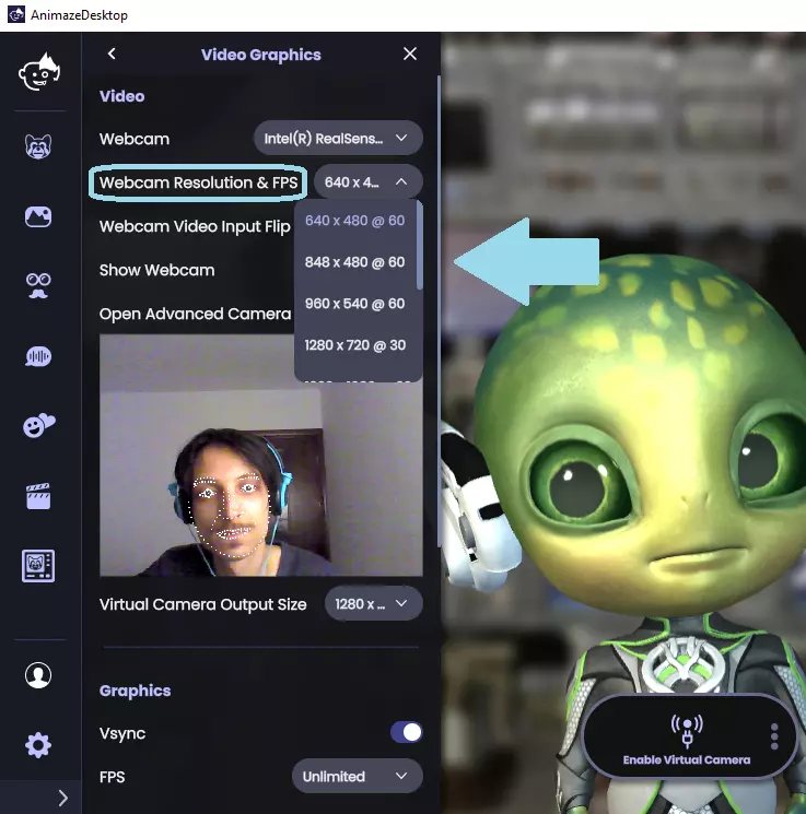 本指南将为你介绍摄像头画面显示为黑色时所需的解决步骤。 如何解决摄像头画面黑屏问题 如果你的用户画面显示为黑色,说明摄像头向Animaze发送的是黑色帧。 1. 尝试在Animaze > 设置 > 视频图形中更改摄像头分辨率。