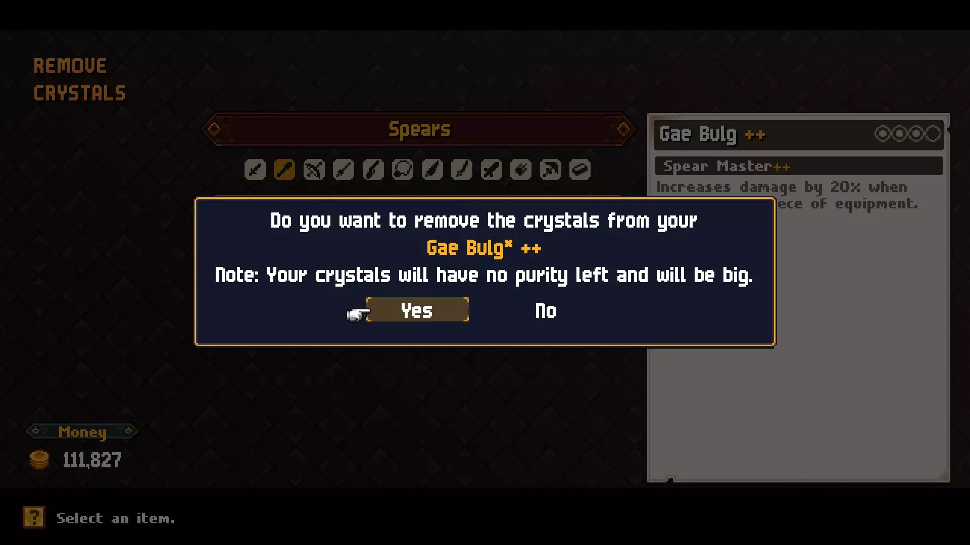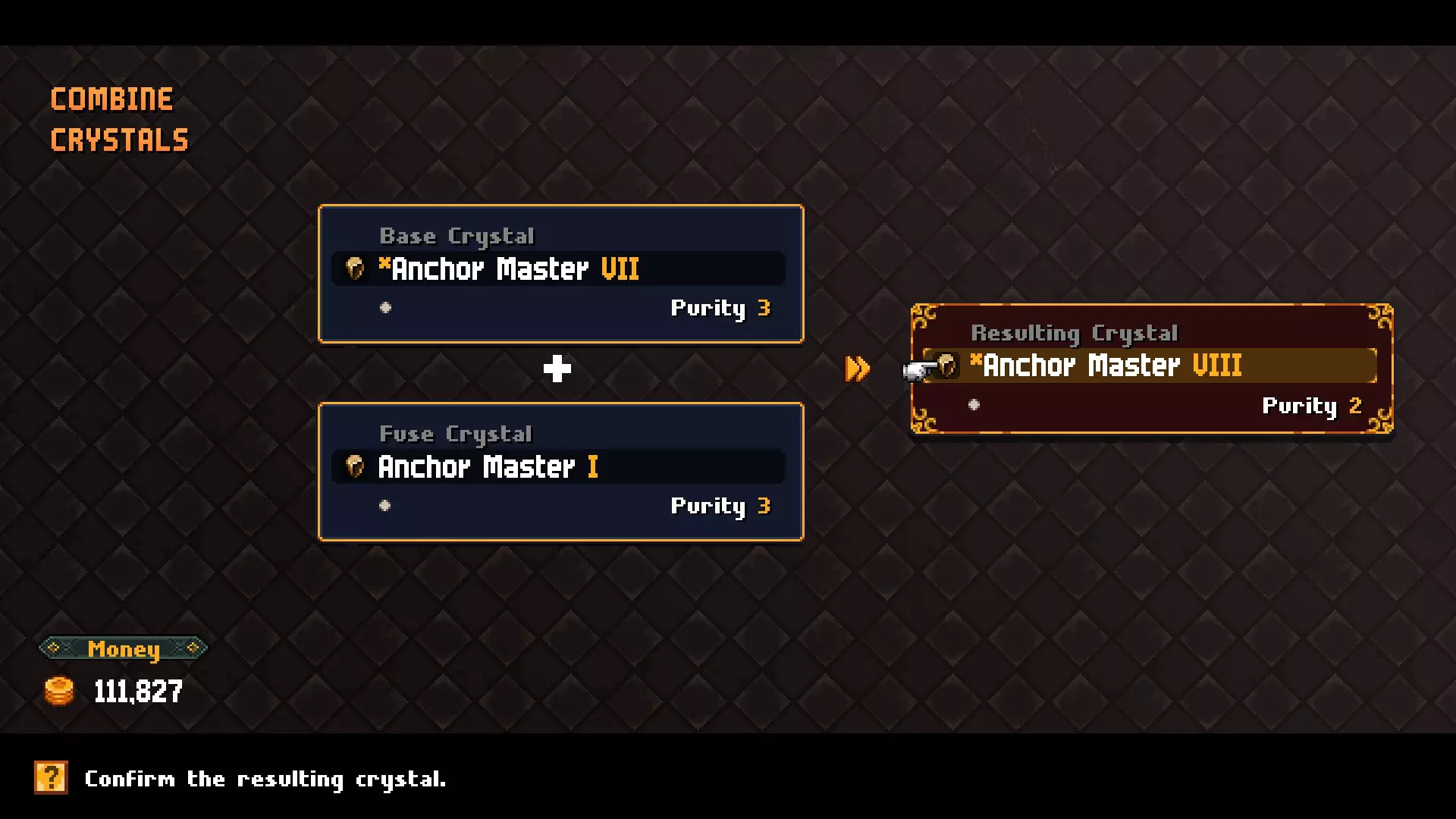 你可以将具有相同能力的水晶进行合成。例如,你可以将一个攻击提升水晶与另一个攻击提升水晶合成(存在一些限制),但无法将攻击提升水晶与防御提升水晶合成。进行合成后,生成的水晶会变为人工水晶(名称旁带有*标记)。 合成需要基础水晶和融合水晶,且对可合成的水晶有一些限制。 基础水晶:可以是任何纯度为1或更高的水晶(选择纯度较高的那个) 融合水晶:可以是任何非人工水晶(可理解为天然水晶)且能力相同 合成结果 合成后的水晶将具有以下属性: 等级:将两个水晶的等级相加(例如,III + III = VI) 纯度:基础水晶的纯度-1 尺寸:取两颗水晶尺寸的平均值并向上取整(1与1合成结果为尺寸1,1与2合成结果为尺寸2,1与3合成结果为尺寸2,以此类推)。这意味着如果在合成过程中使用过任何尺寸2或3的水晶,就不可能得到尺寸1的水晶。 从装备上移除水晶