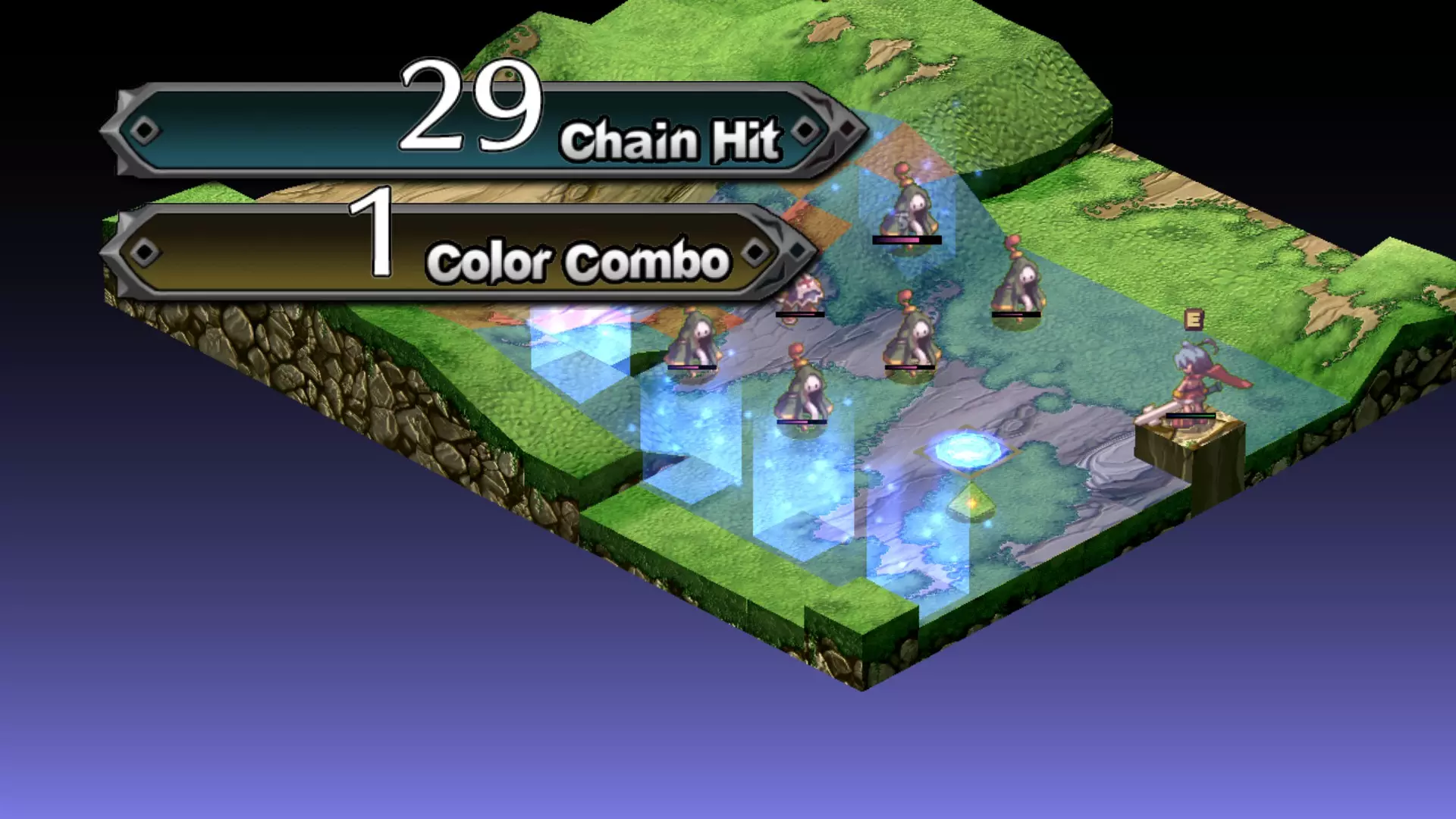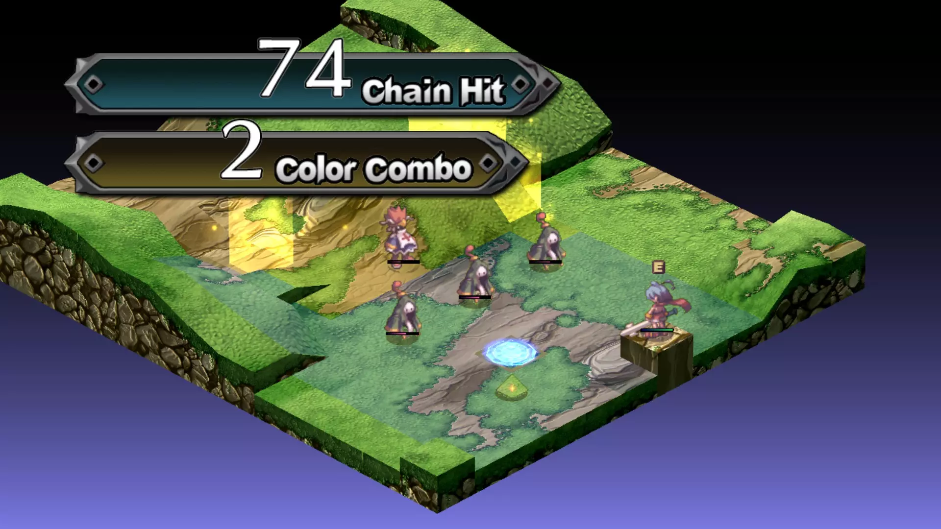 这里,你同样有几个选择: 先攻击红色符号,引发完整的连锁反应。 攻击黄色符号,会错过一个步骤。 攻击绿色符号,只会将所有红色面板变为绿色。你需要破坏另一个符号来触发新的连锁反应。 不过,这样做的意义何在呢? 除了能在一次行动中消灭大部分敌人外, geo连锁(原词:geo chains)对奖励计量条(原词:Bonus gauge)的提升幅度也远大于单纯的击杀或连击。关卡结算时,奖励计量条越高,通关地图获得的额外奖励就越多。