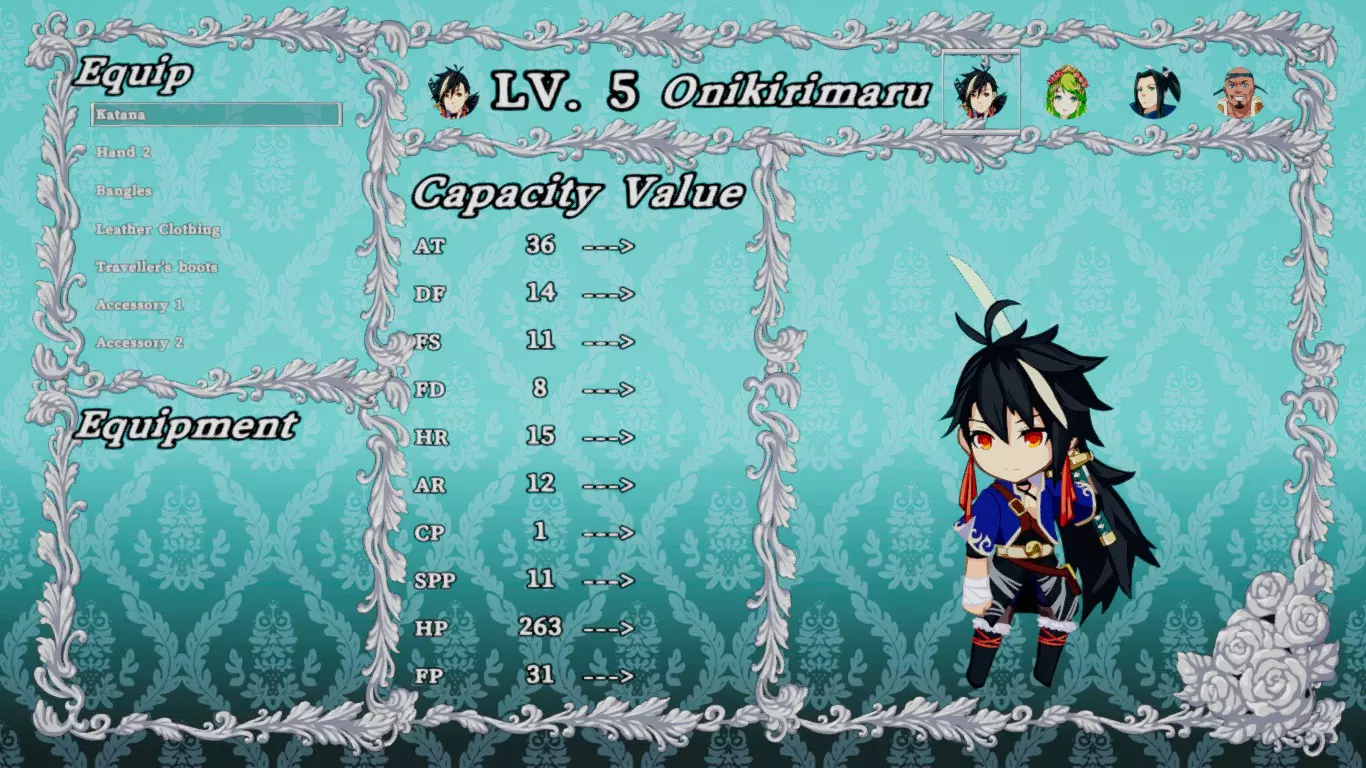 基础属性包括:AT、DF、FS、HR、AR、FD,以及HP和FP。 正如游戏所解释的,HP代表生命值,FP代表魔法(风水)值;AT代表攻击力,DF代表防御力……但其他属性是什么呢? 部分装备会影响FS、FD和AR属性: - 龙水公主使用的书籍和鬼斩丸使用的魔剑会影响FS和FD,因此它们可能与“魔法”或“智力/智慧”相关。 - 头饰(也称为手镯)会影响FD属性,所以它是防御属性,可能代表魔法防御力。 - footwear会影响AR属性,因此它可能类似“速度”或“敏捷”。 - 虽然目前我尚未发现影响HR的物品,但我推测HR可能与“生命值”相关,比如“物理抗性”或“体质”。目前我们已知的基础属性如下: AT = 攻击 DF = 防御 FS = 与魔法或智力/智慧相关(实际为魔法) HR = 与生命值相关(物理防御或体质) AR = 速度或敏捷(实际为敏捷) FD = 魔法防御 除基础属性外,还有与其相关联的次级属性:ARP、BOP、FSP、HRP、SPP和FSG。 ARP与AT相关,可能代表【暴击率】(因其数值低于AT,或许表示暴击的百分比)。 SPP与AR相关,可能代表【速度】(因此AR应理解为“敏捷”)。 BOP与DF相关,但目前尚未发现影响该属性的物品或装备,暂无法了解其作用机制。 FSP和FSG与“魔法”相关,分别关联FS和FD属性。HRP 似乎与“物理”相关(我猜测),因为它和 HR 有关联,而 HR 又与生命值相关。 目前已知的次要属性如下: ARP = 暴击(?) BOP = 仍未知 FSP = 与魔法相关(可能是魔法强度?) HRP = 与生命值相关(可能是物理抗性?) SPP = 速度 FSG = 与魔法相关(可能是魔法闪避?魔法抗性?) 装备界面属性