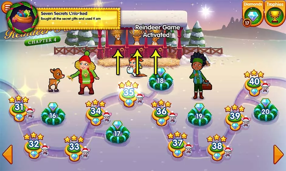 秘密6 位置:第六章 - 圣诞老人的家 在商店花费250金币购买槲寄生。当你开始第六章的任意关卡时,槲寄生会悬挂在门上方。点击槲寄生即可解锁秘密6。当槲寄生被选中时,如果有情侣进入商店,他们可能会接吻! 秘密7 位置:地图 使用关卡选择地图左右两侧的箭头滚动至霍莉的驯鹿农场。点击畜栏里的3只驯鹿,即可揭开最终秘密并解锁驯鹿游戏!选择任意关卡开始游玩吧。